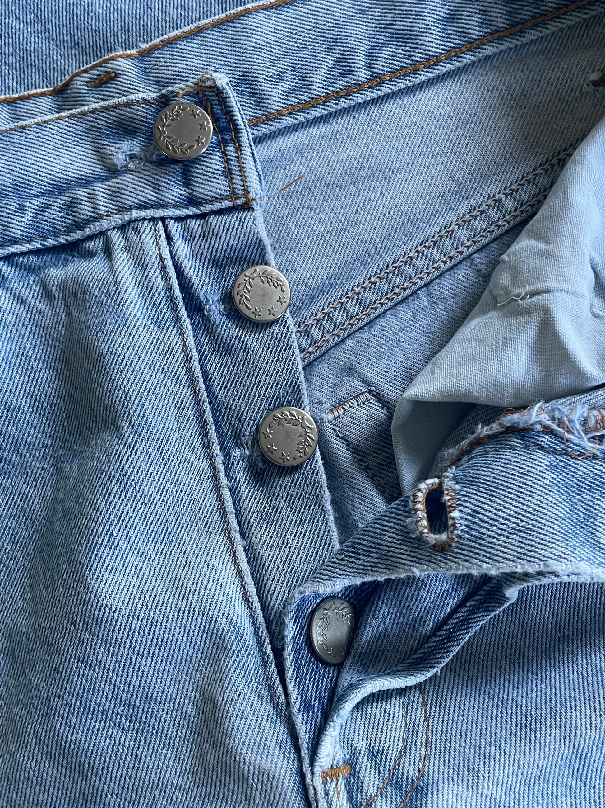 With tiny hole near crotch and light fray at back pocket, front pocket tips and hemline. Mid rise with 4 button closure - previous owner has replaced and slightly adjusted original riveted buttons to provide a smidgen more room.