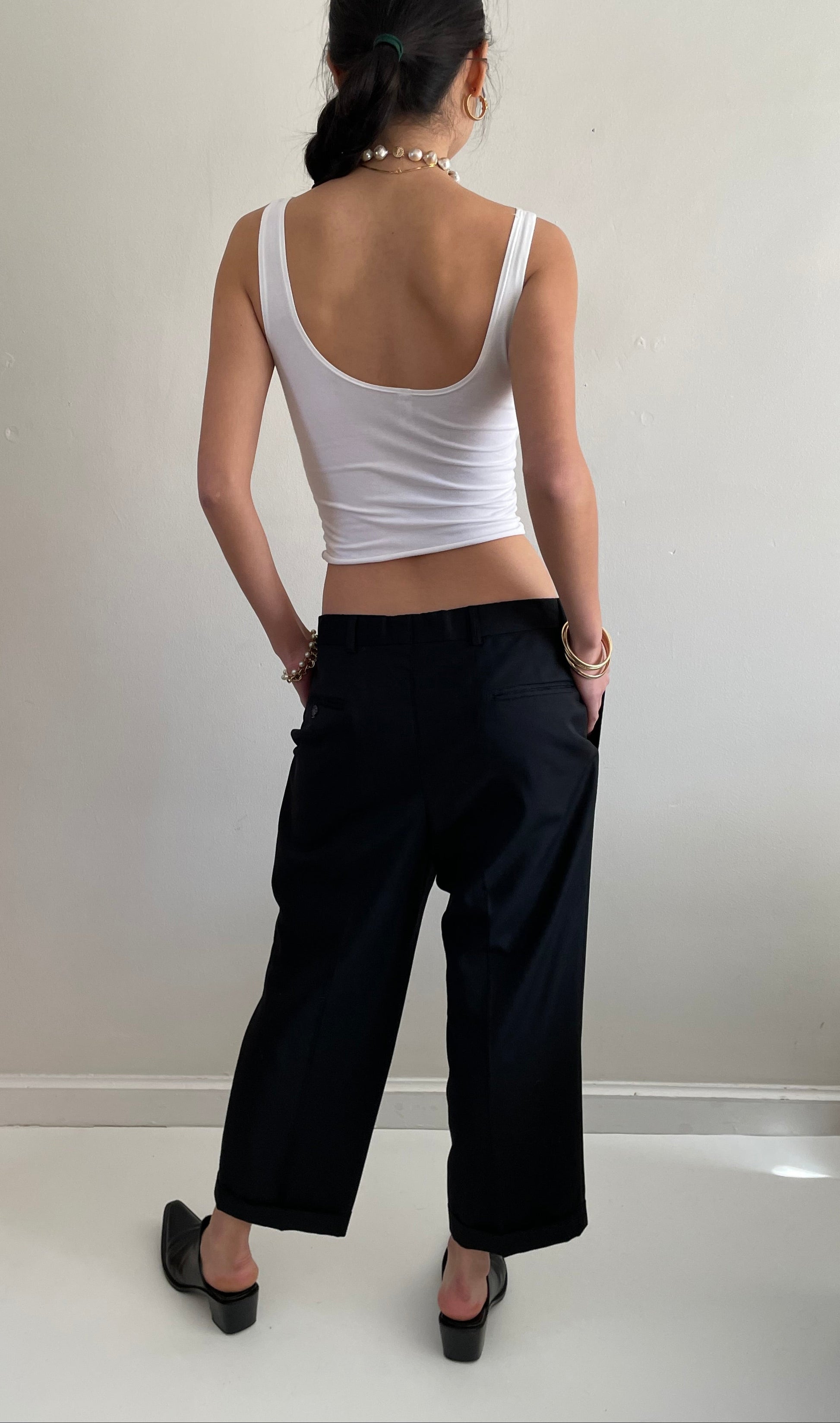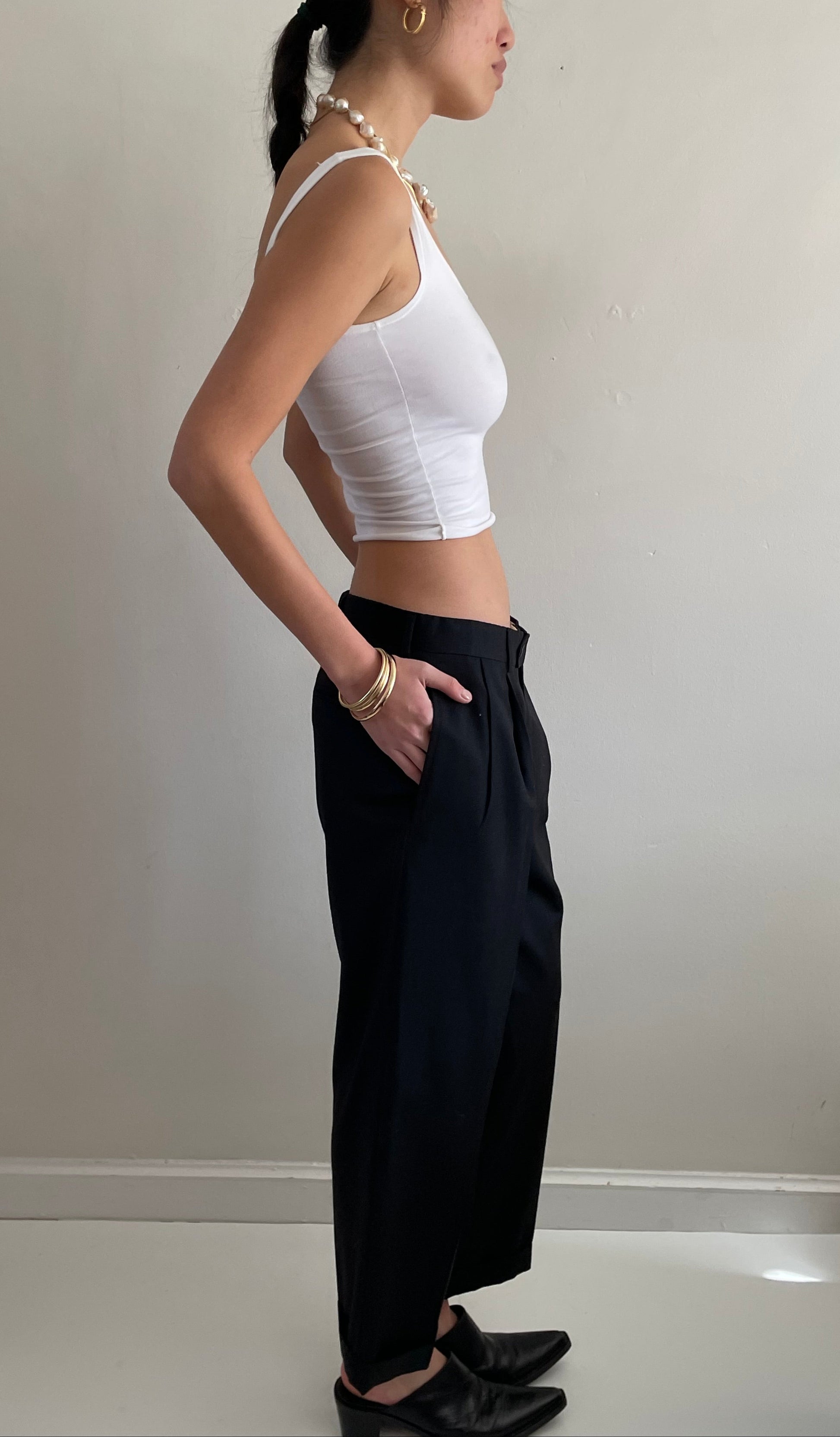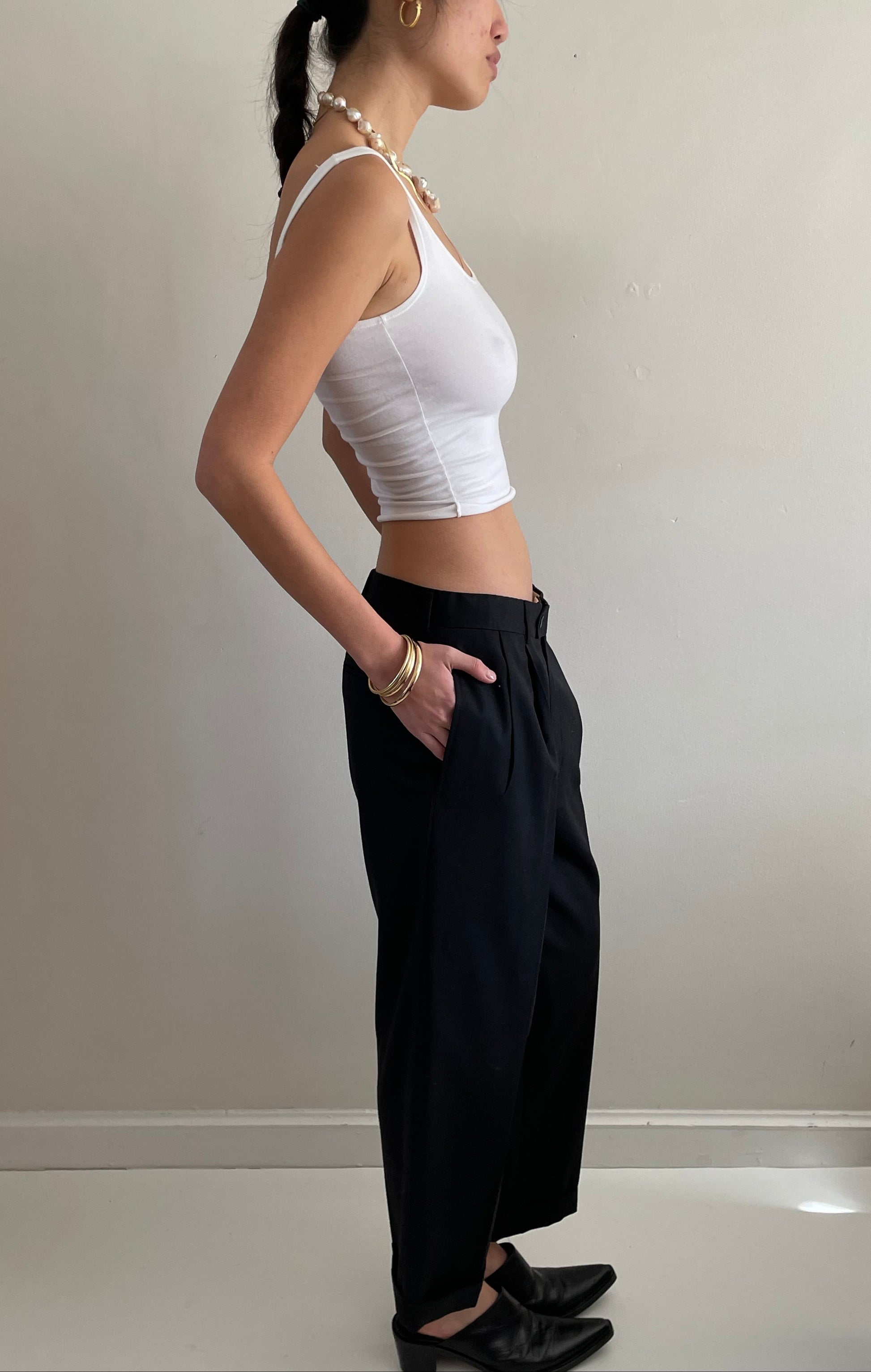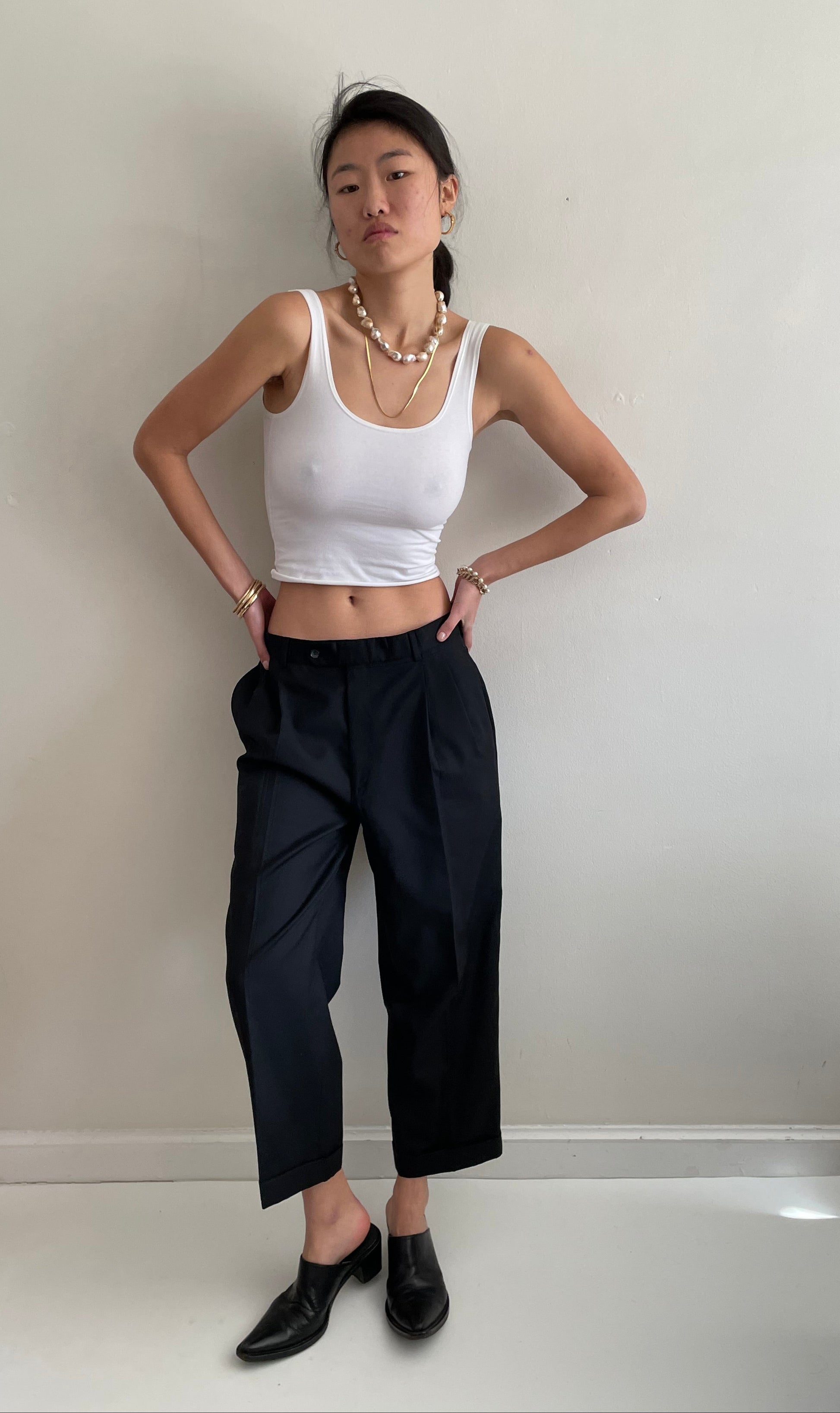 Vintage minimalist wool pants featuring pleated front and wide, cuffed cropped leg.