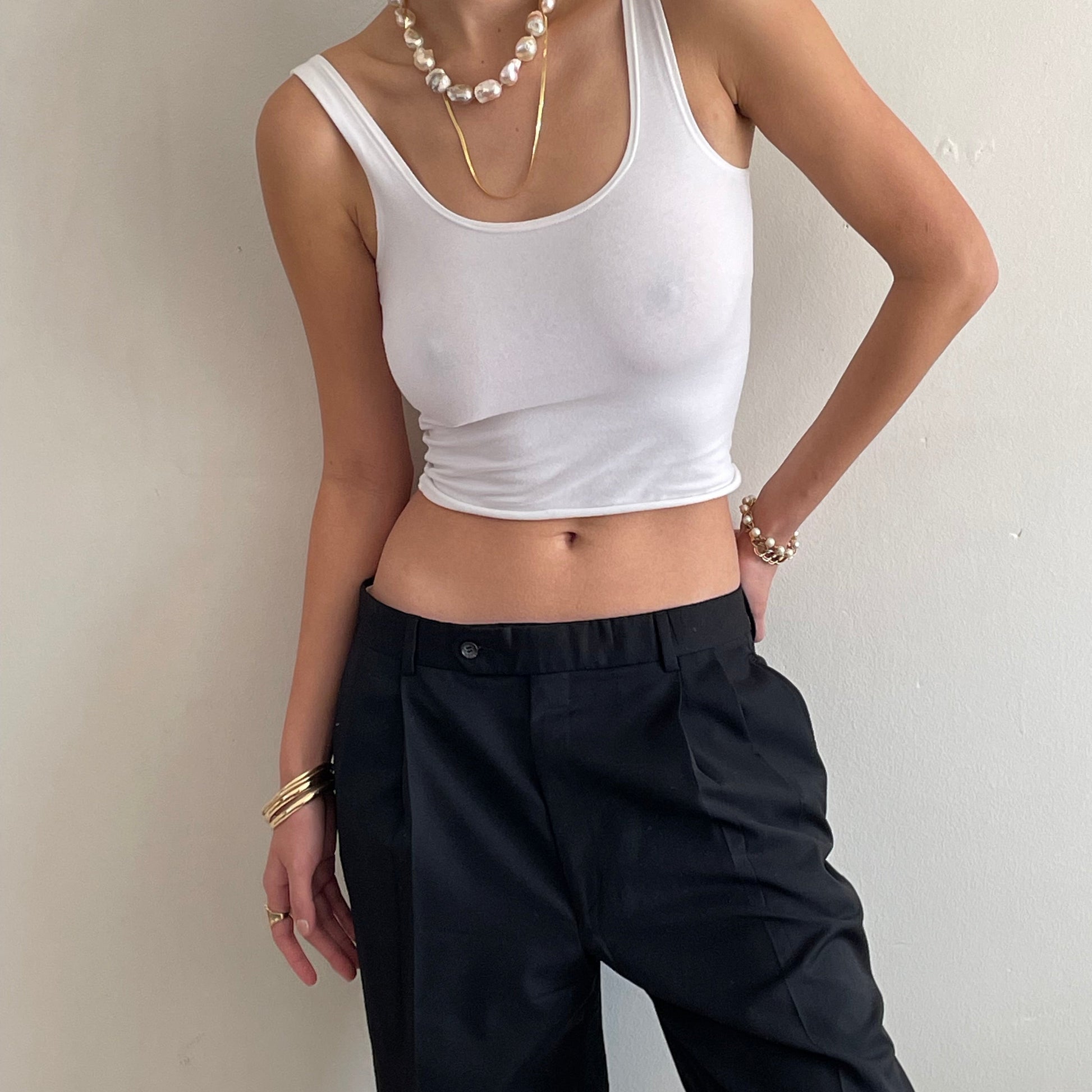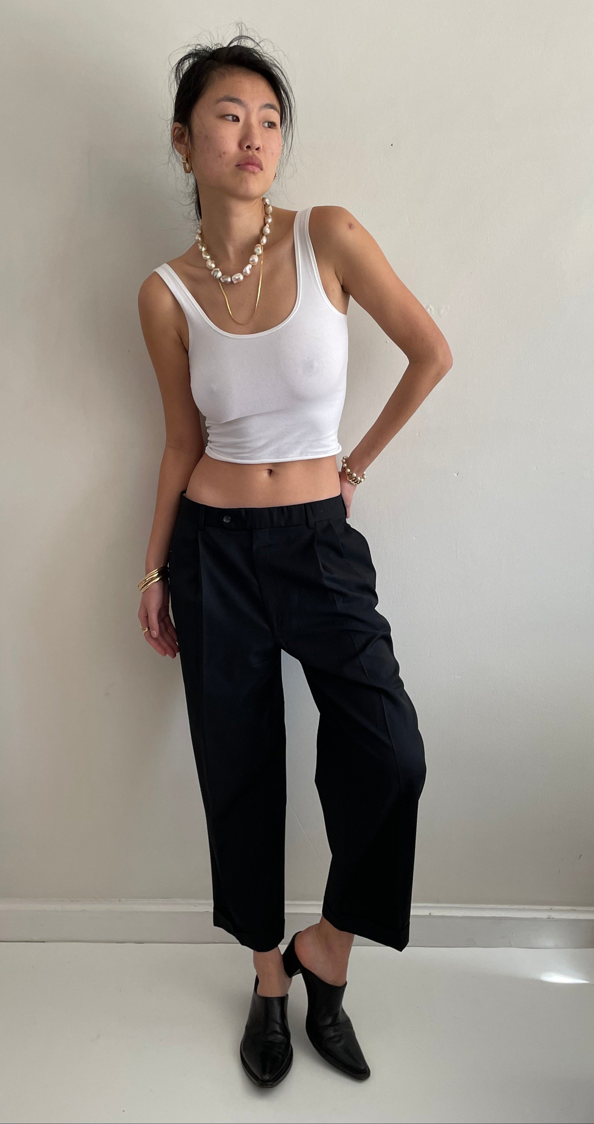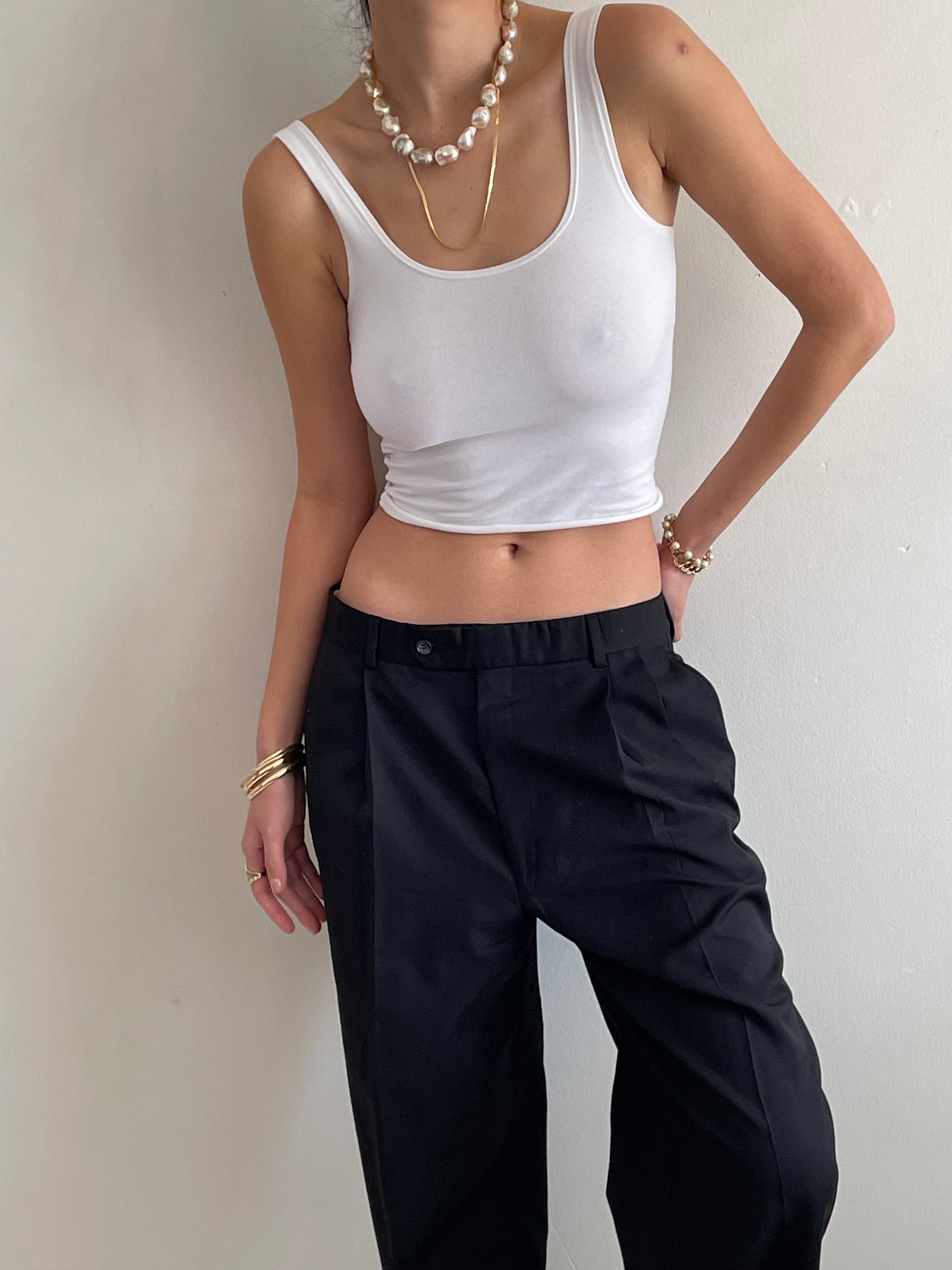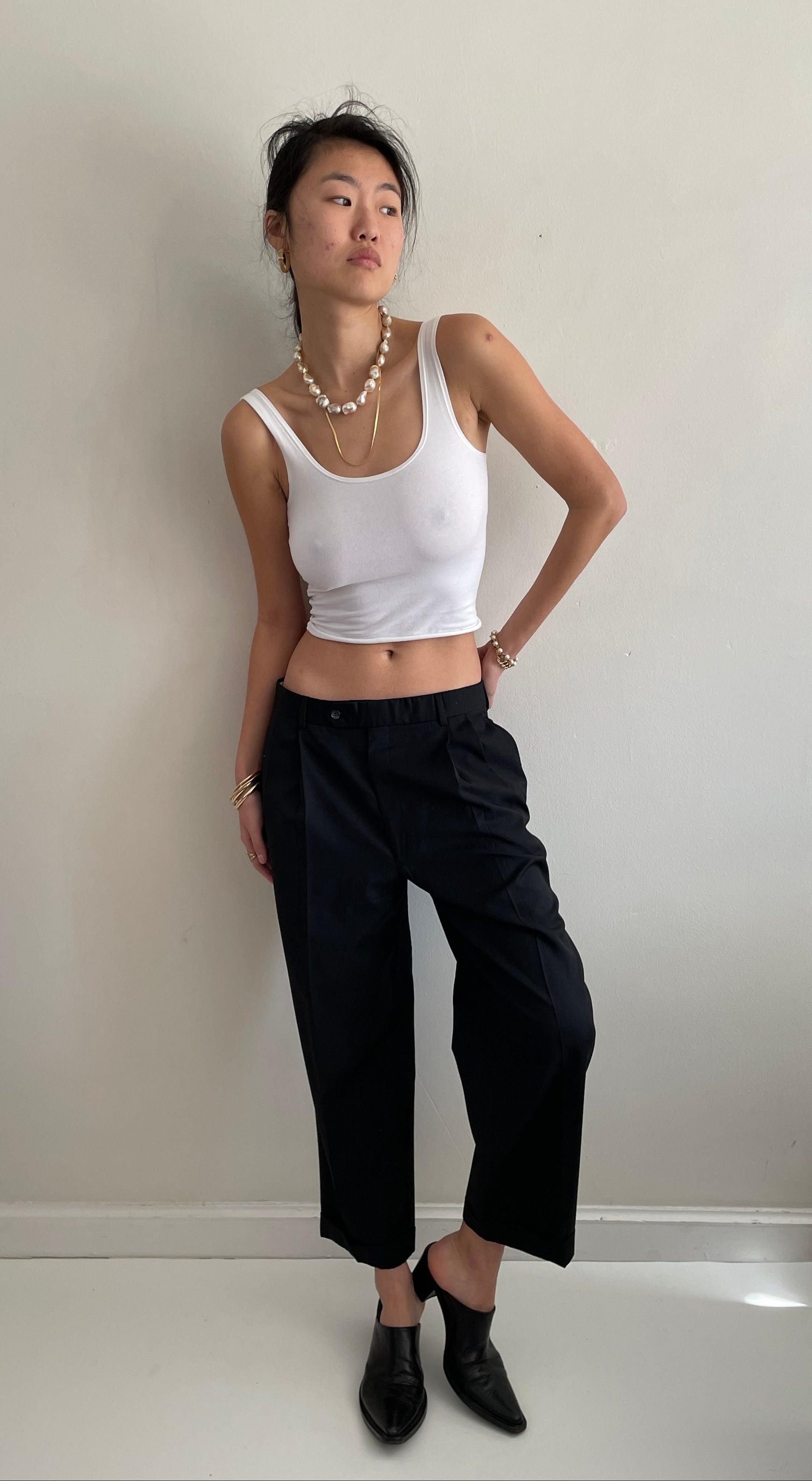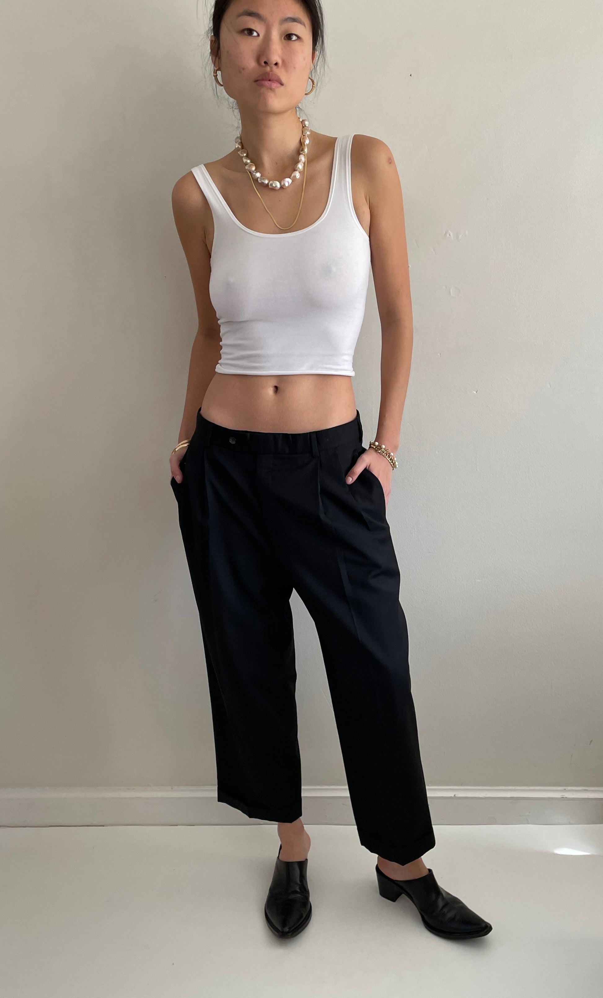 Vintage minimalist wool pants featuring pleated front and wide, cuffed cropped leg.