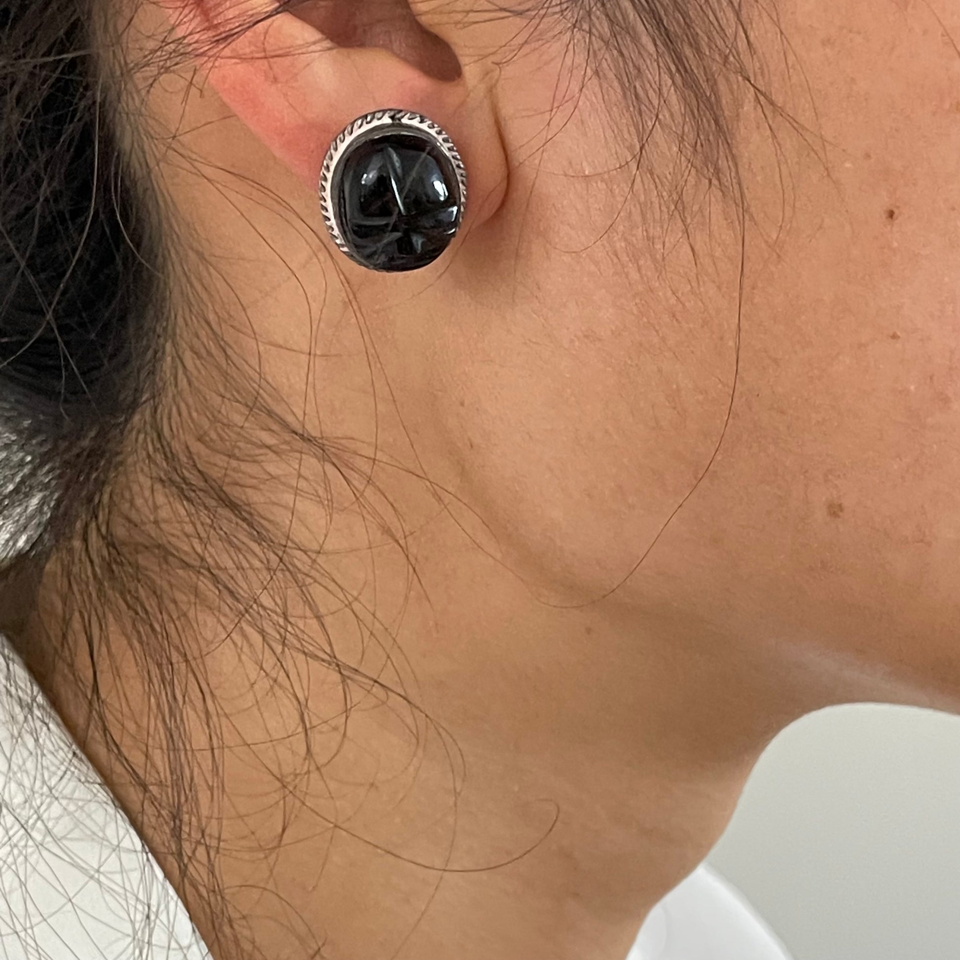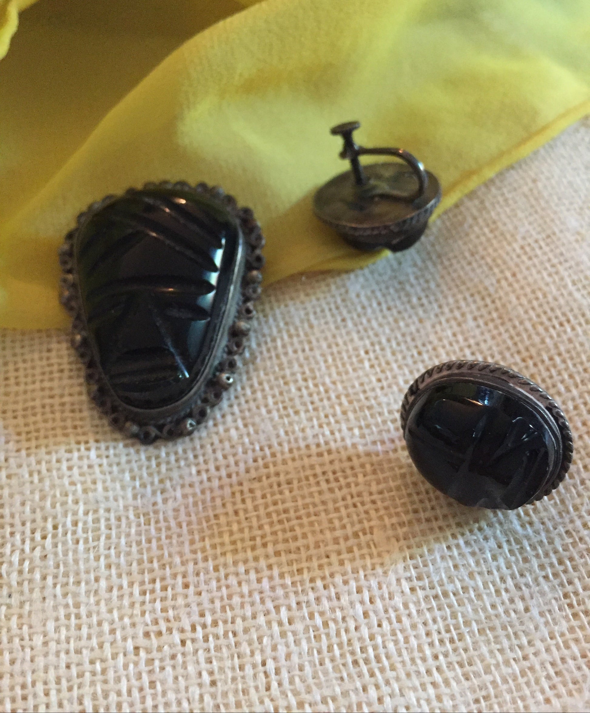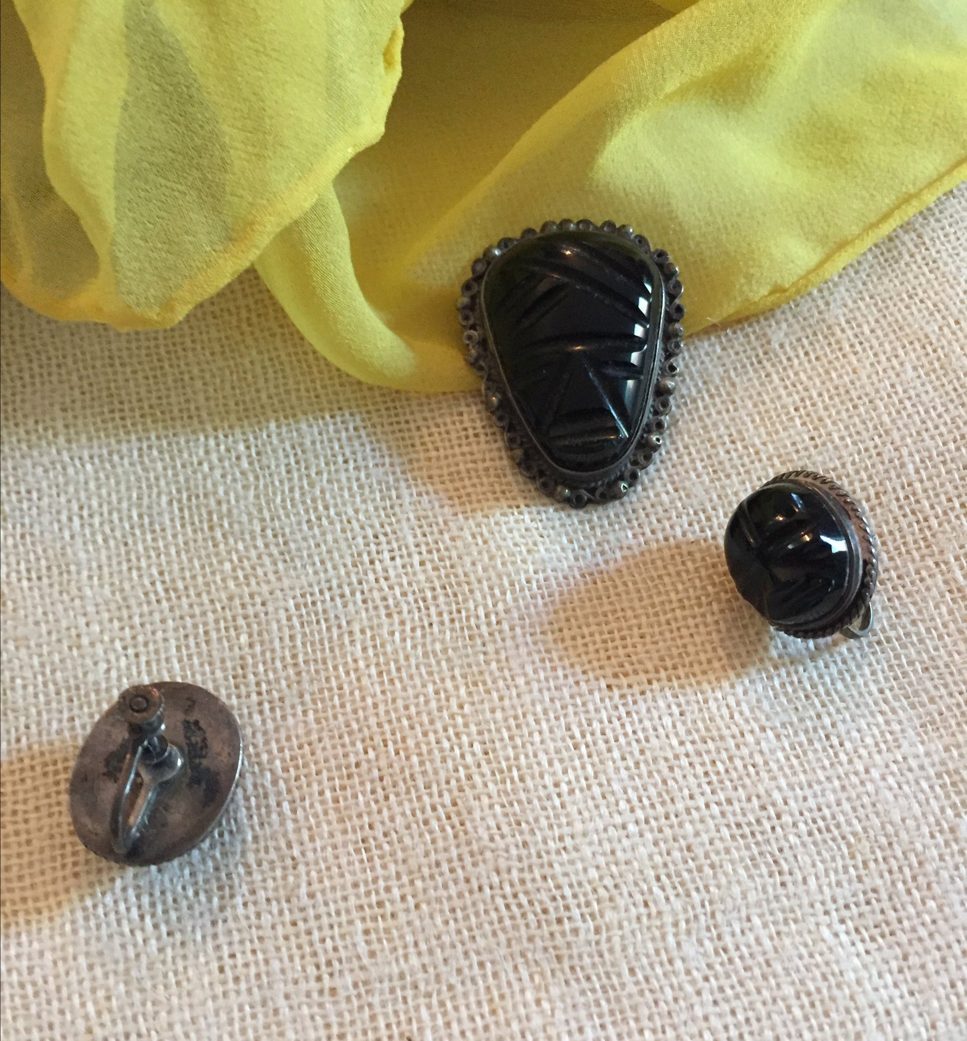 Vintage hand crafted 3 piece set featuring sterling silver and carved black onyx made in Mexico. Purchased by my mother in the 1950s.