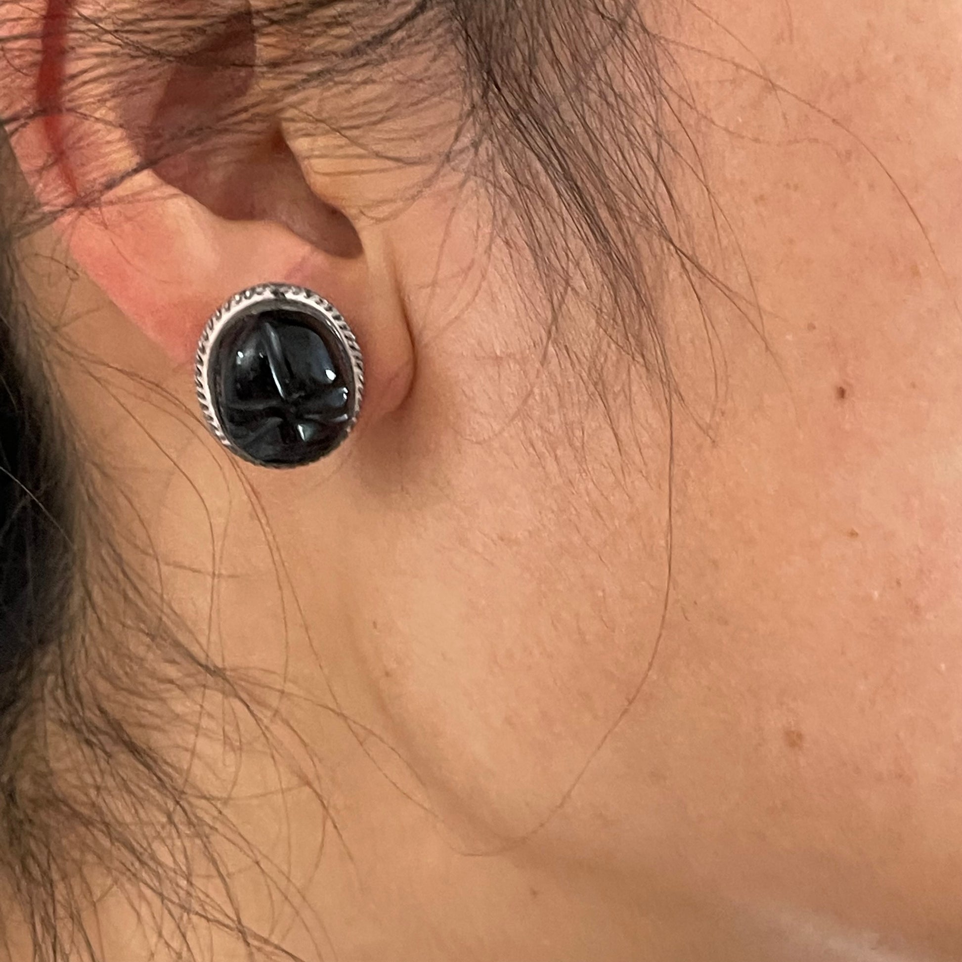 Vintage 50s Carved Onyx Earrings + Pin Brooch Matching Set Taxco Hand Crafted in Mexico Sterling Silver Carved Onyx Set