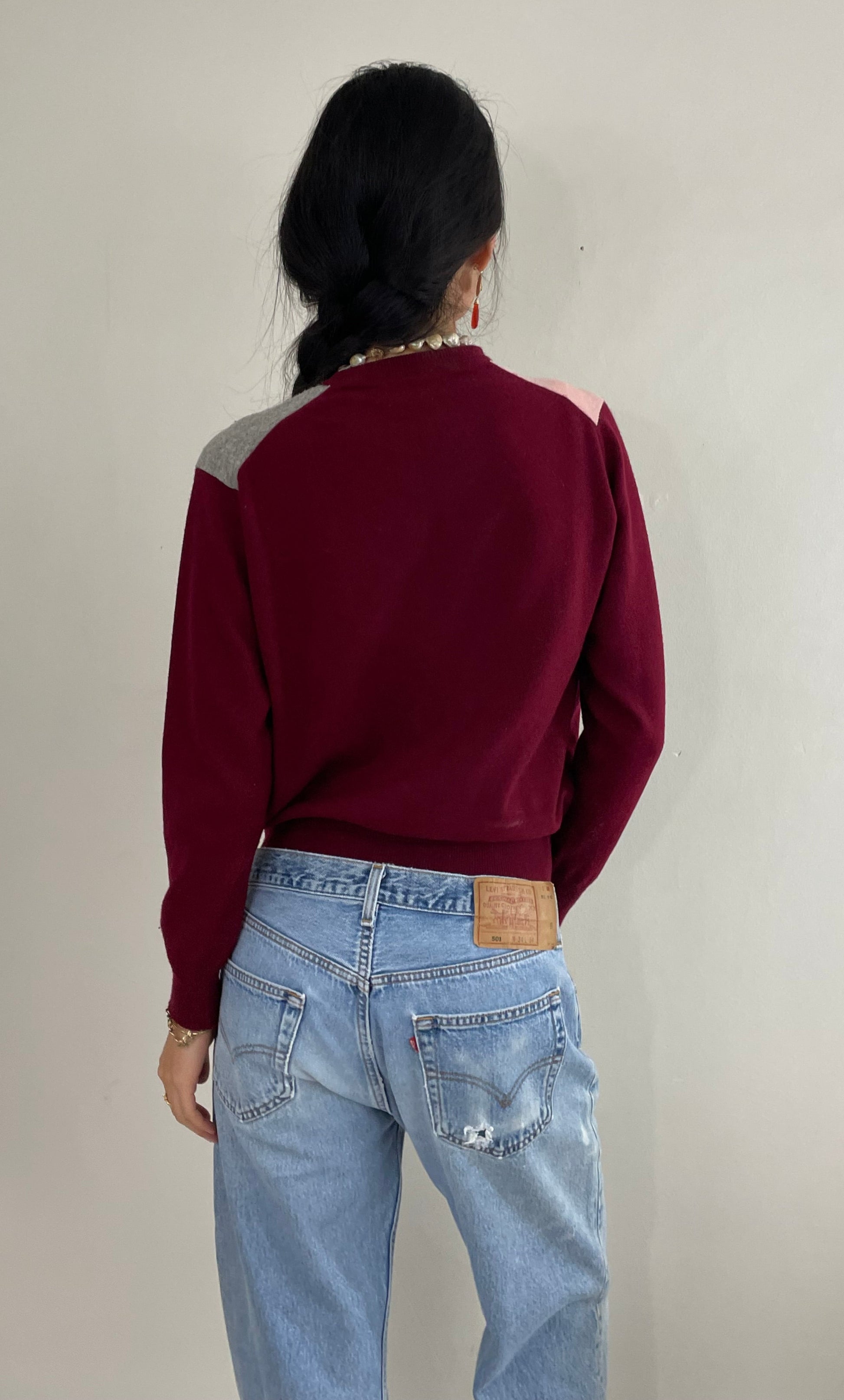 Vintage 100% Cashmere Intarsia Knit Crewneck Pullover Wine Pink Gray ColorBlock Medium