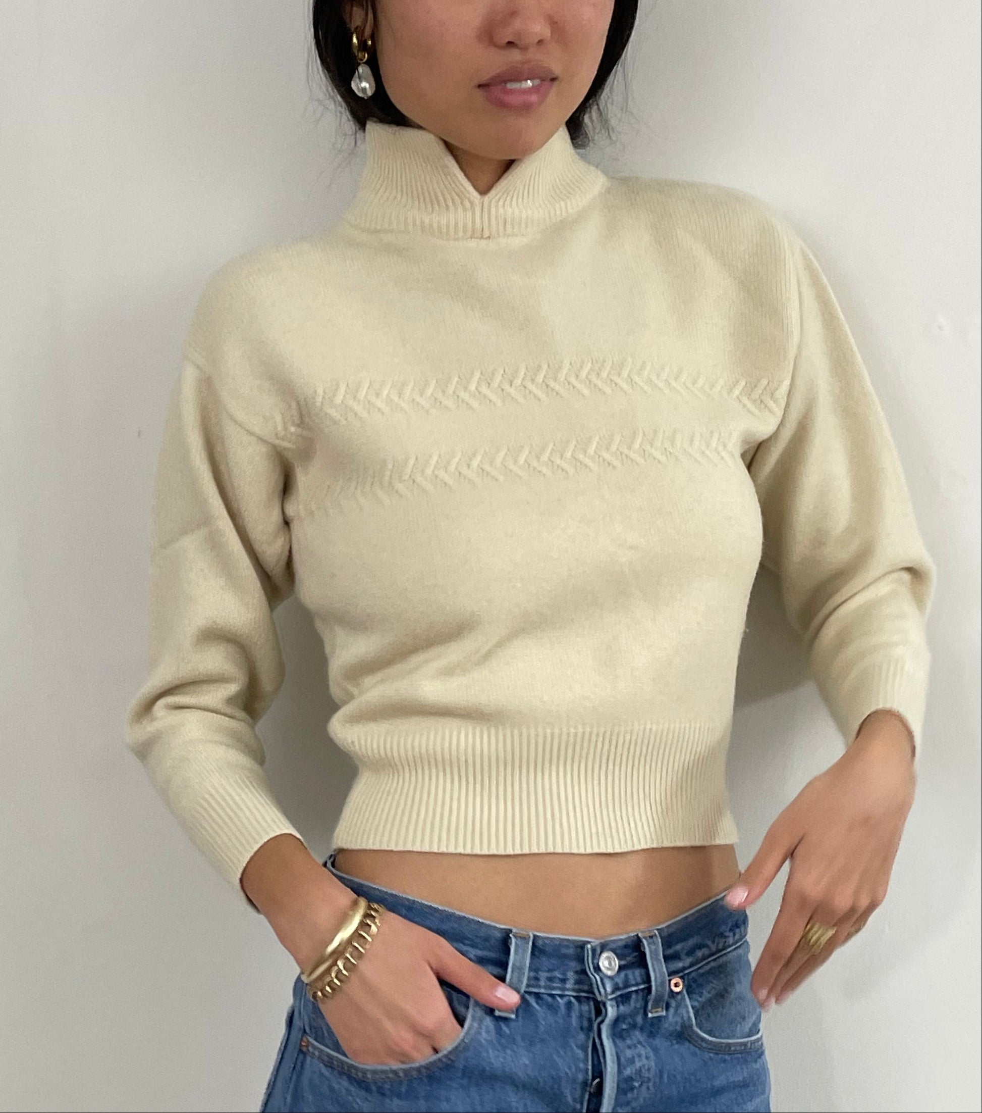 Vintage 100% Cashmere Cropped Mockneck Ivory Cream Thick Sweater | Small