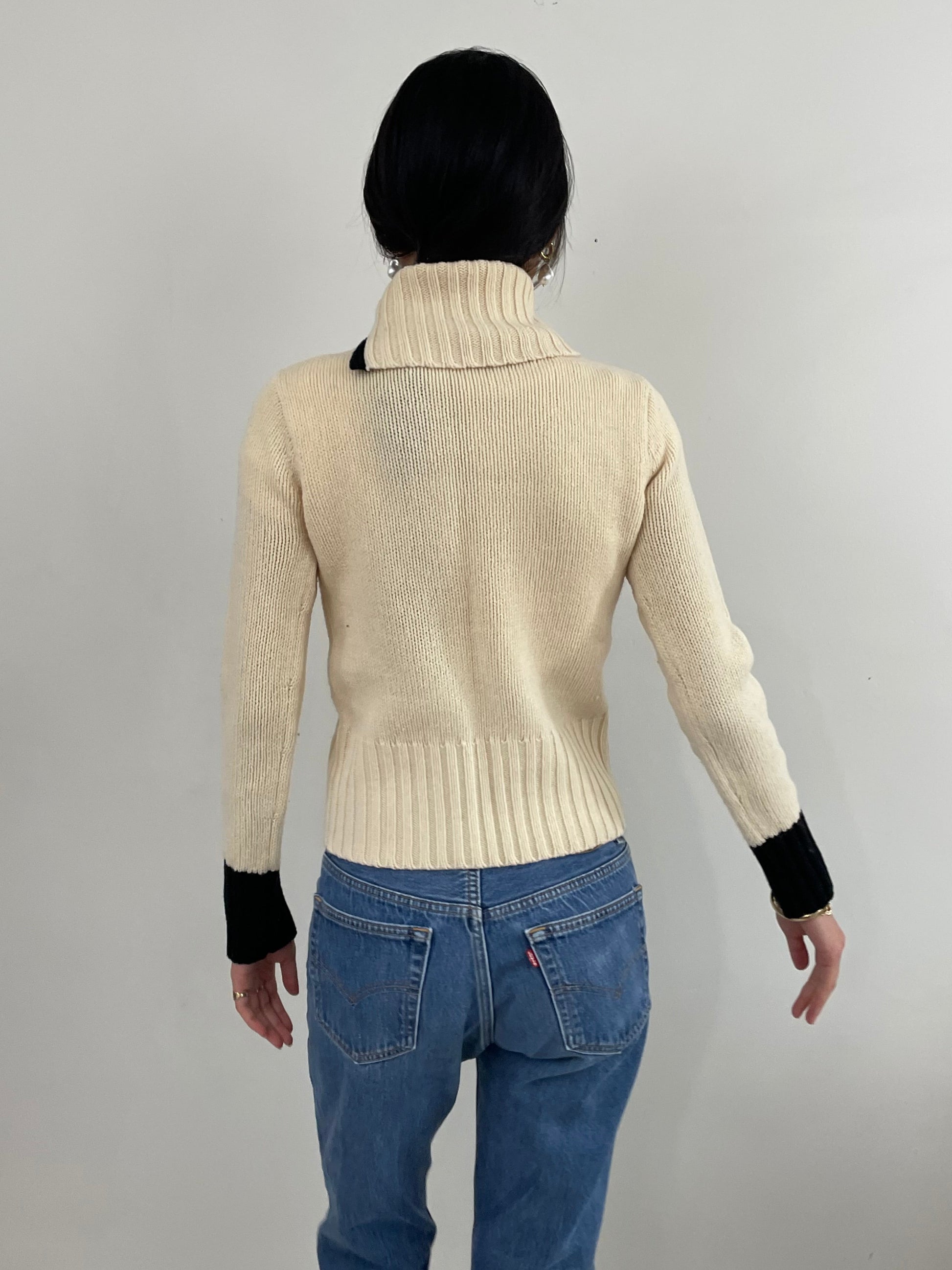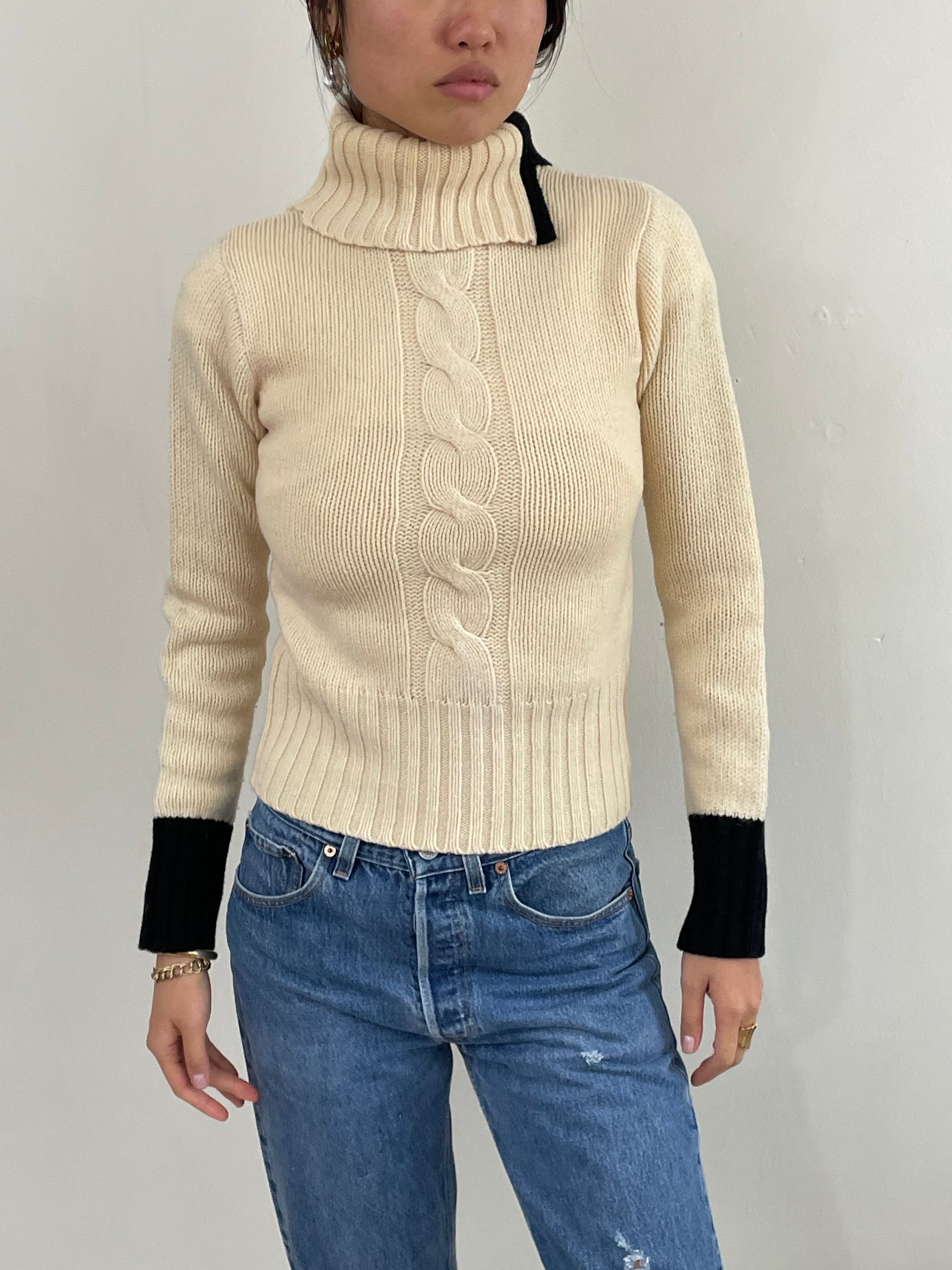 Minimalist DKNY ivory wool sweater featuring fold over ribbed turtleneck with black trim detail at notched neckline and cuffs. Central cable knit and cropped length. Thick, warm lambswool sweater.