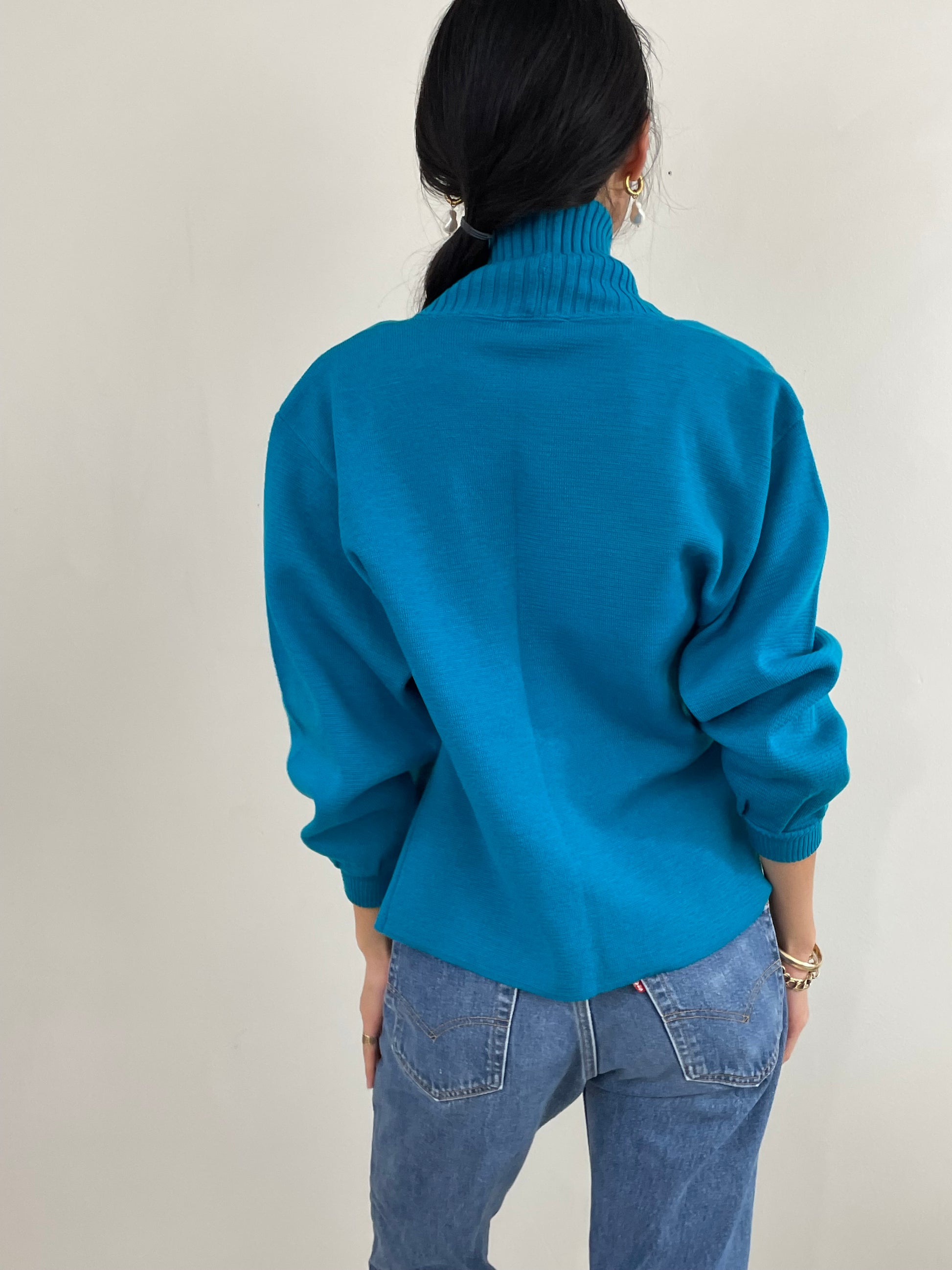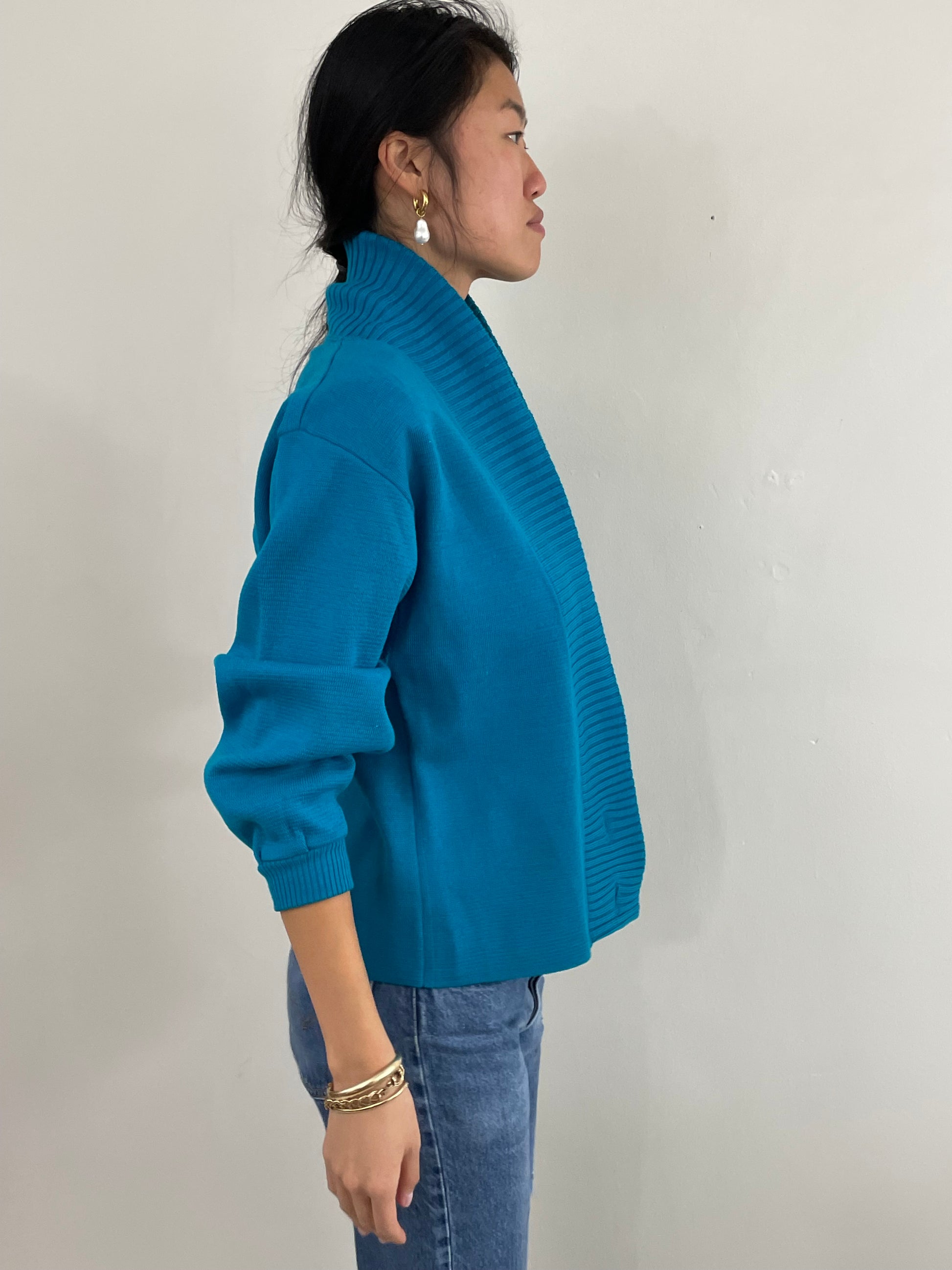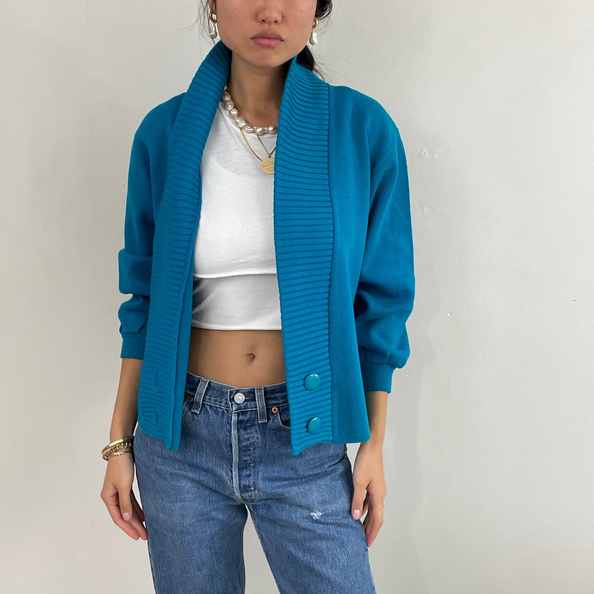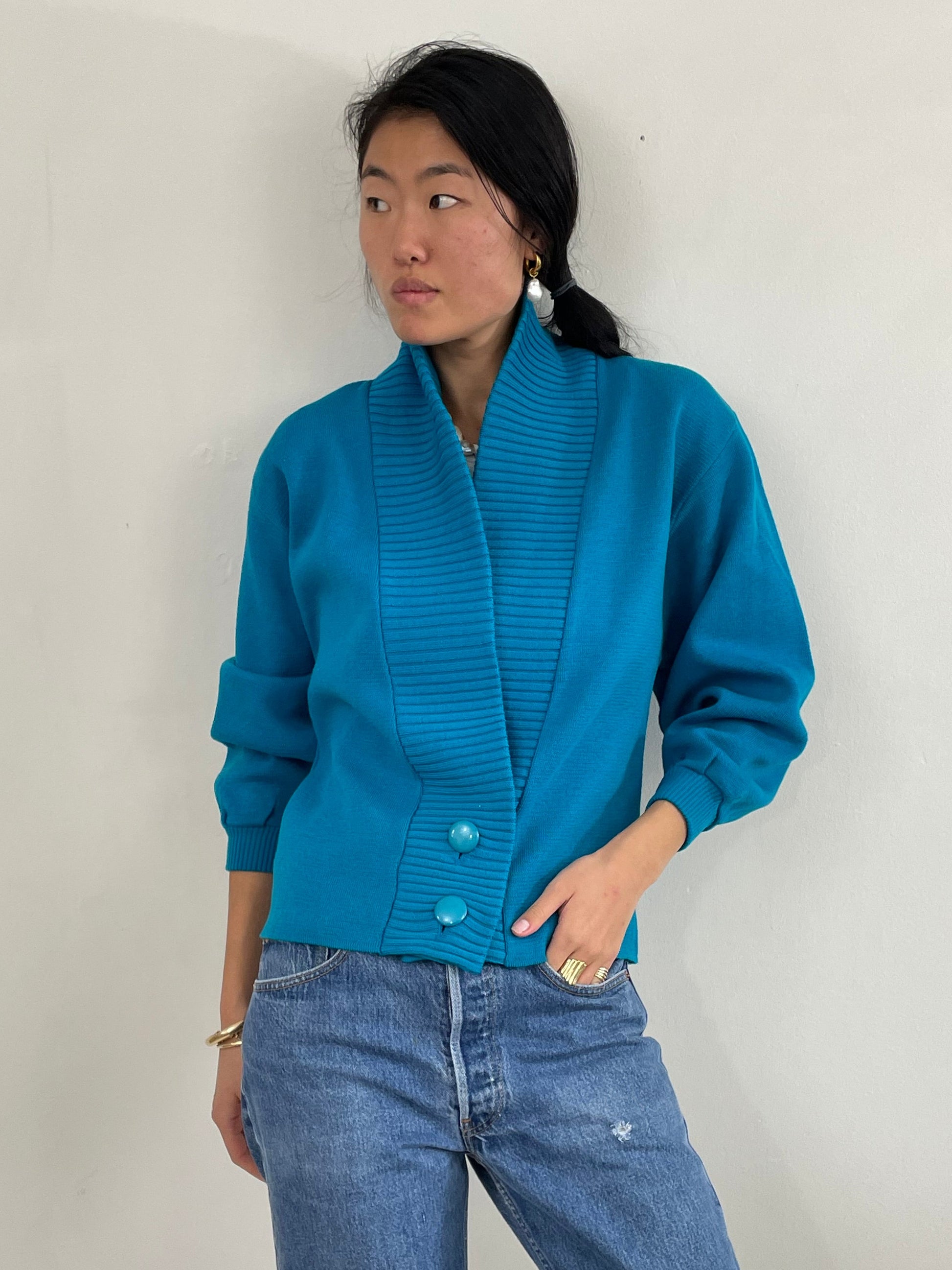 A vibrant turquoise cardigan made in Great Britain of machine washable 100% wool. This is one of those sweaters that "wears like iron". It is in excellent vintage condition - with no sign of pilling or wear. The cardigan features a plunging neckline with ribbed shawl collar. Glossy button closure and cropped length. Ribbed knit at cuffs, dropped shoulder and balloon-style sleeve.