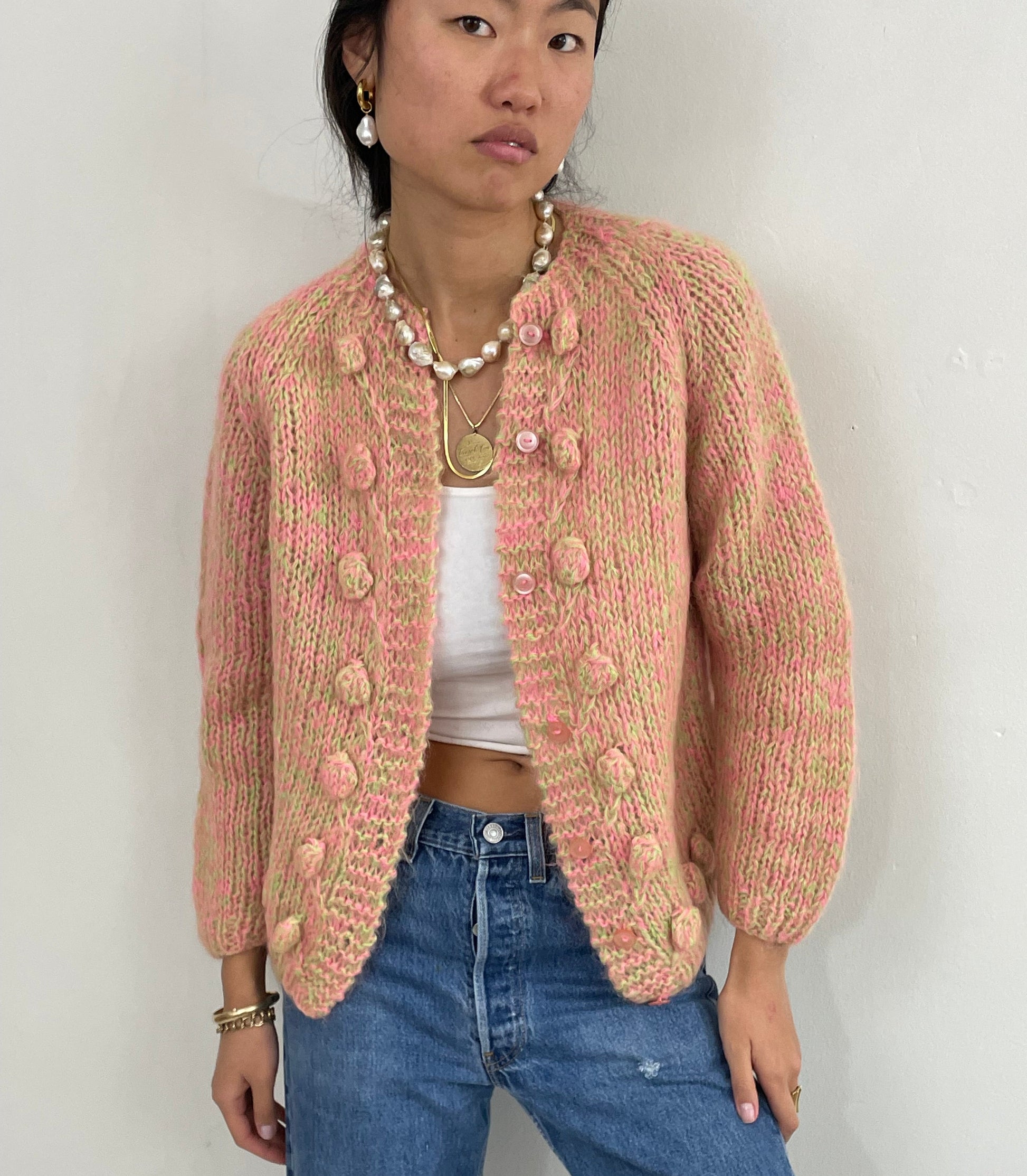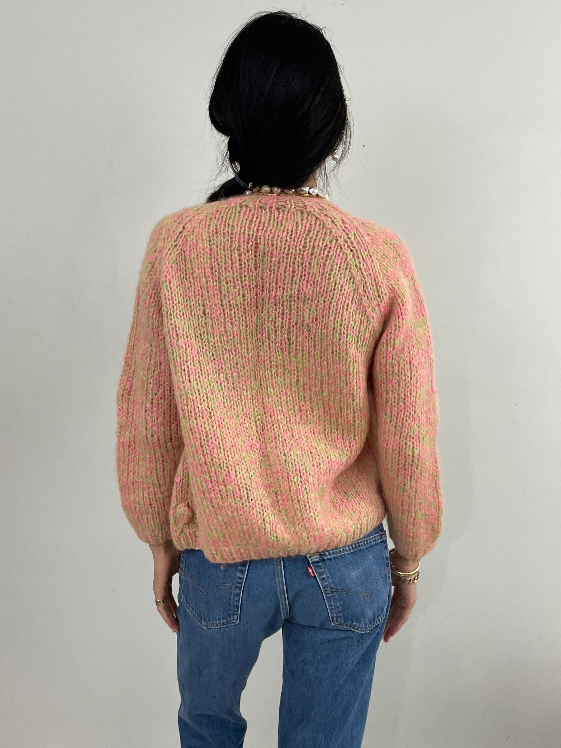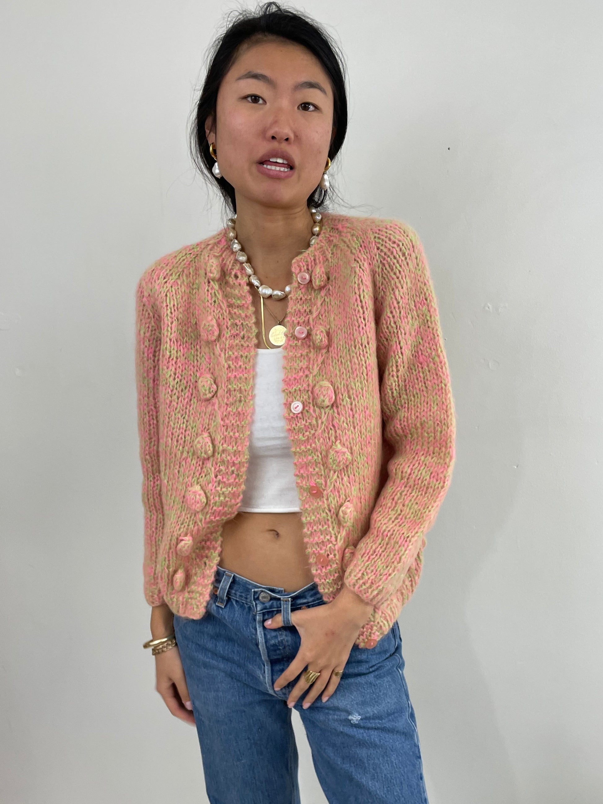 Featuring variegated space-dyed mohair yarn. Hand knit in Italy with charming pom pom accents and favorite raglan sleeve. With button front closure and crew neckline. Thick, fuzzy one of a kind sweater..