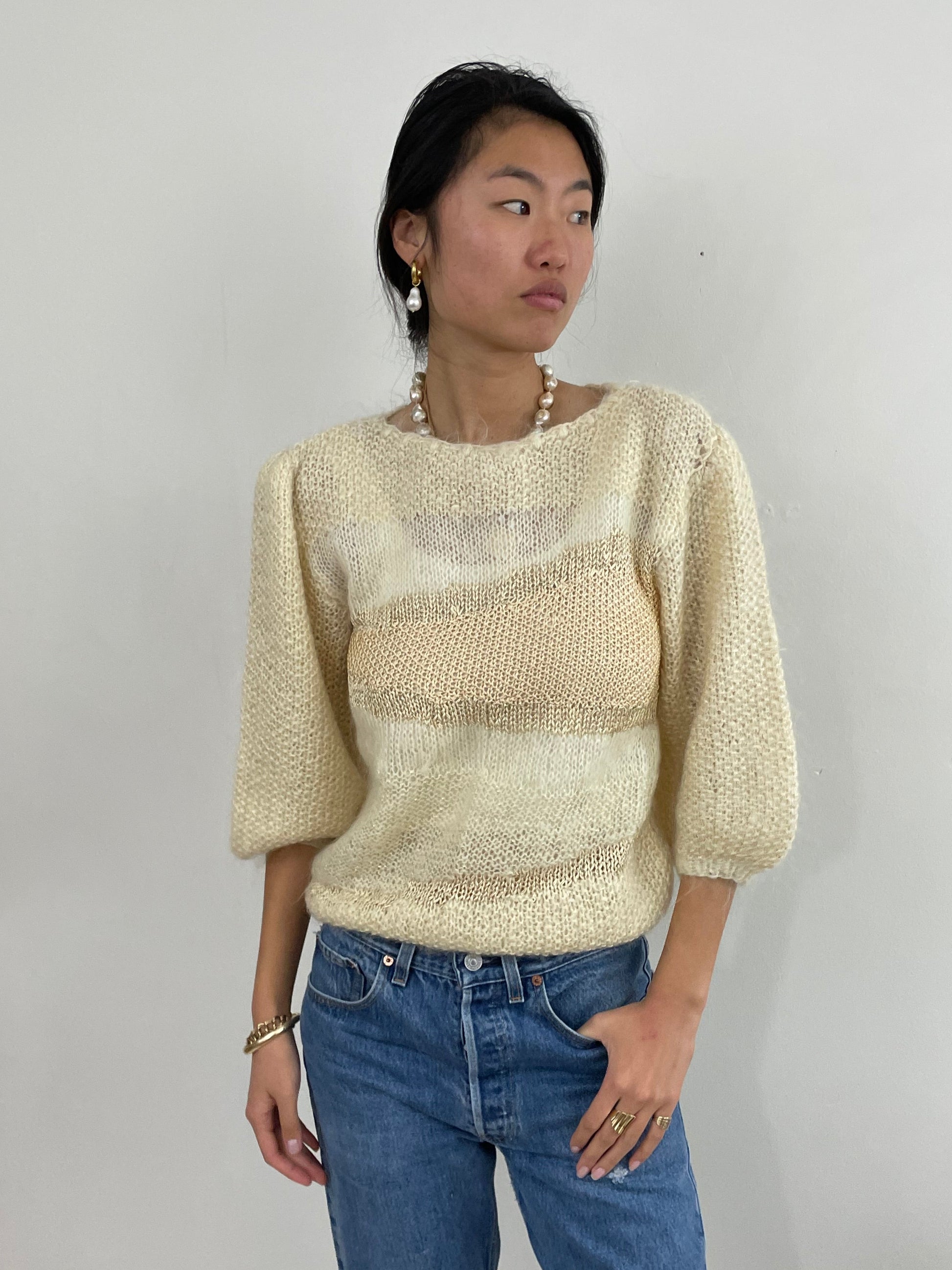 Vintage hand knit mohair and silk sweater featuring a variety of textured yarns in minimalist pattern. With boat neckline and balloon sleeves. Moss stitch and fuzzy details on gorgeous neutral sweater.