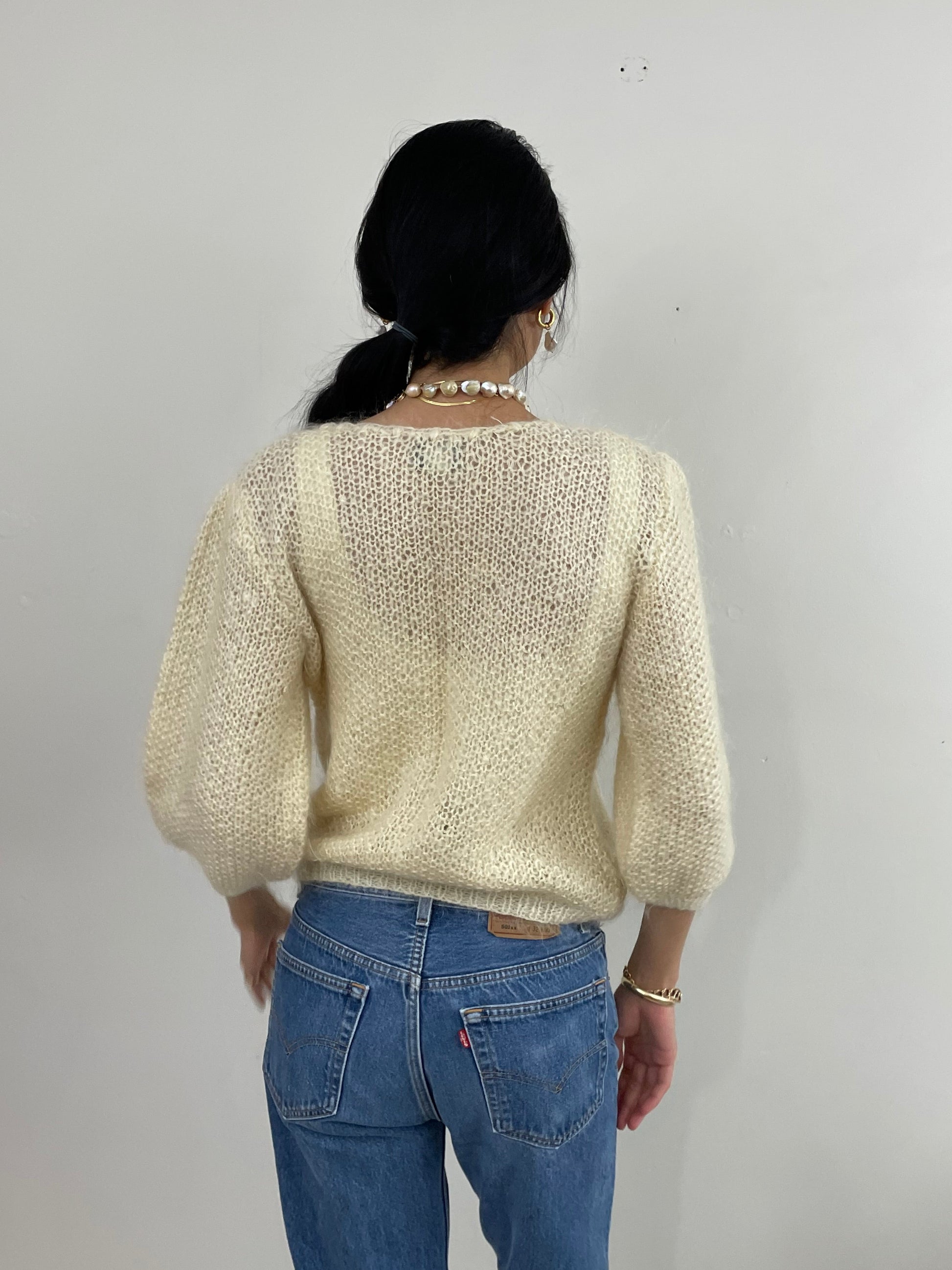 vintage 90s Handknit Mohair + Silk Ivory Fuzzy Boatneck Sweater