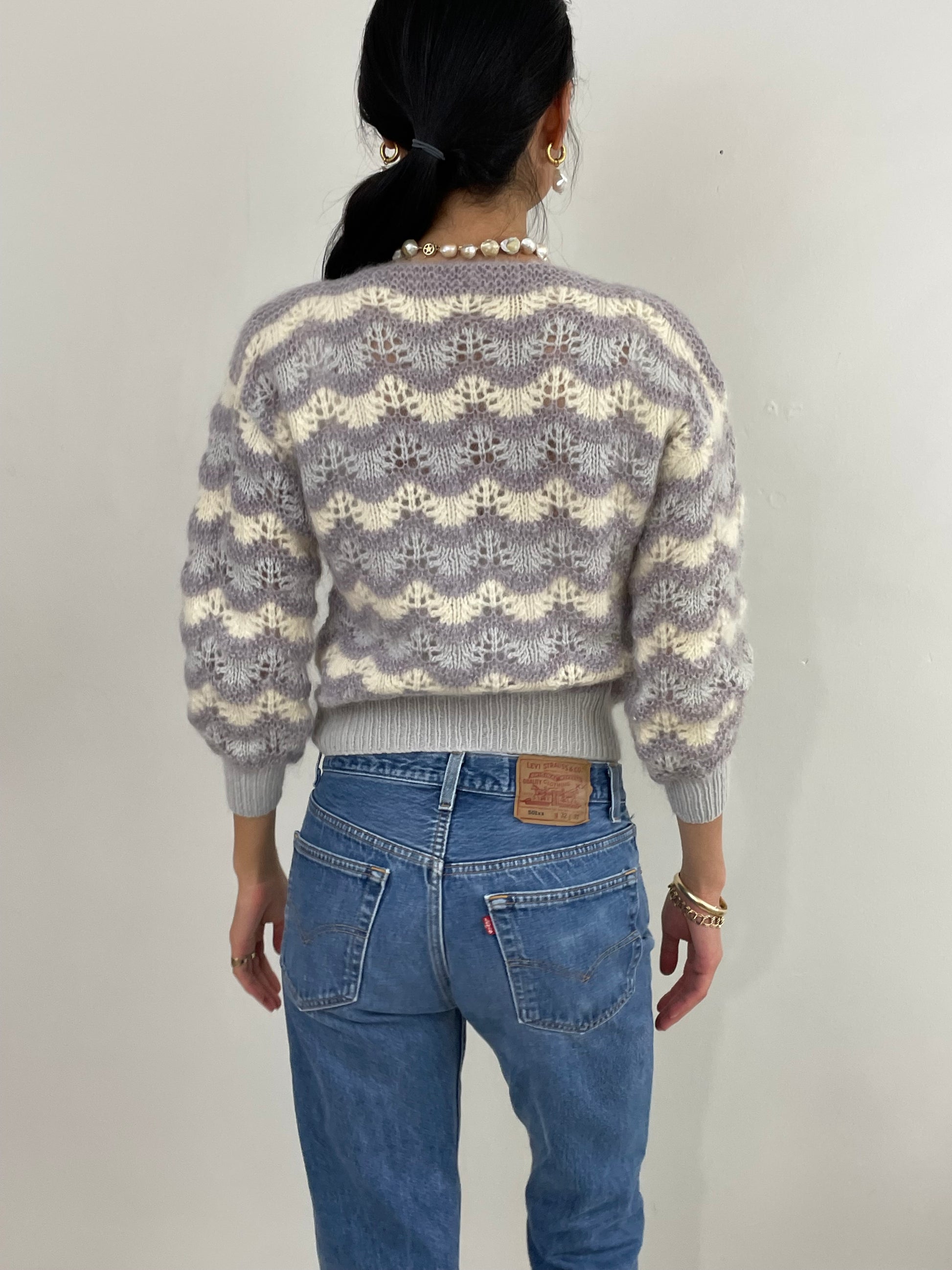 Vintage 70s Hand Knit Mohair Chevron Pointelle Open Knit Sweater