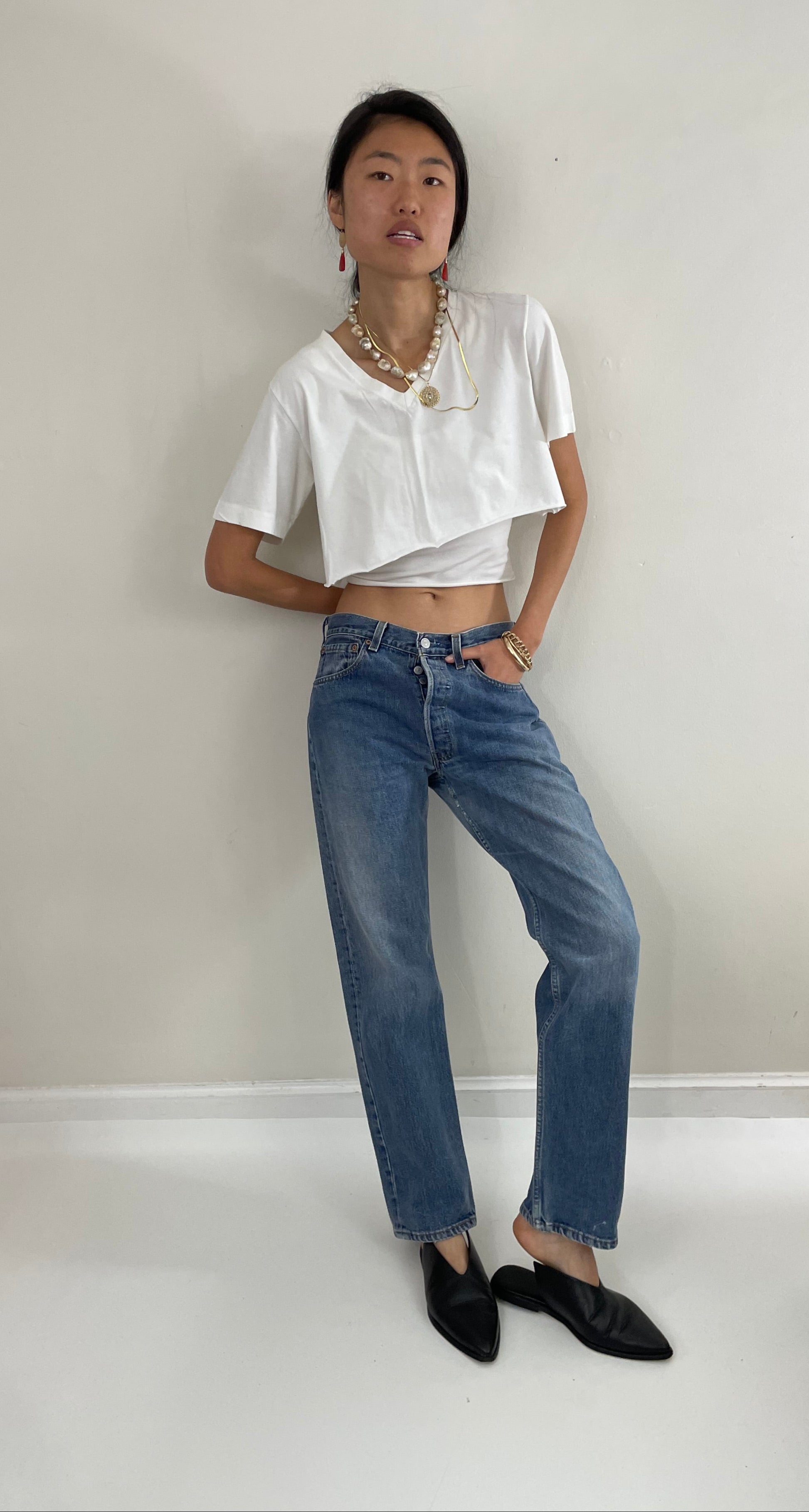 Vintage 1980s Levi's 501 jeans made in USA with naturally and evenly faded medium to dark wash denim.