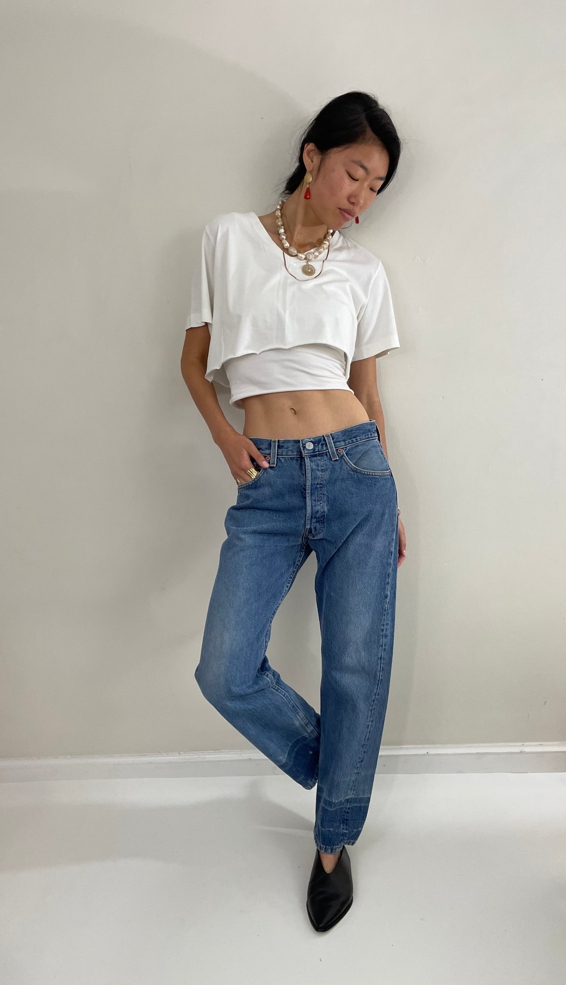 Vintage 1980s Levi's 501 jeans made in USA with naturally faded medium to dark wash denim.