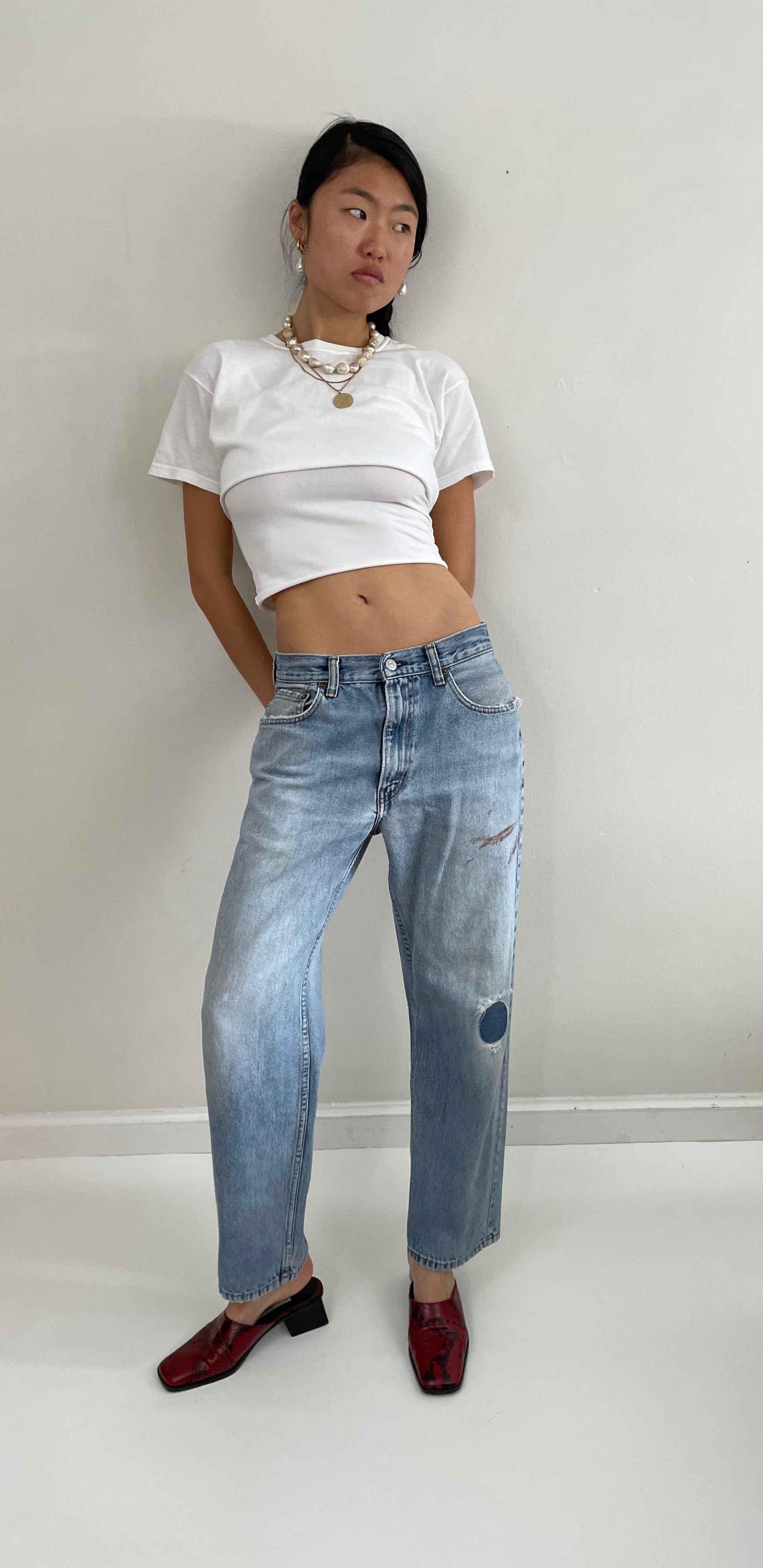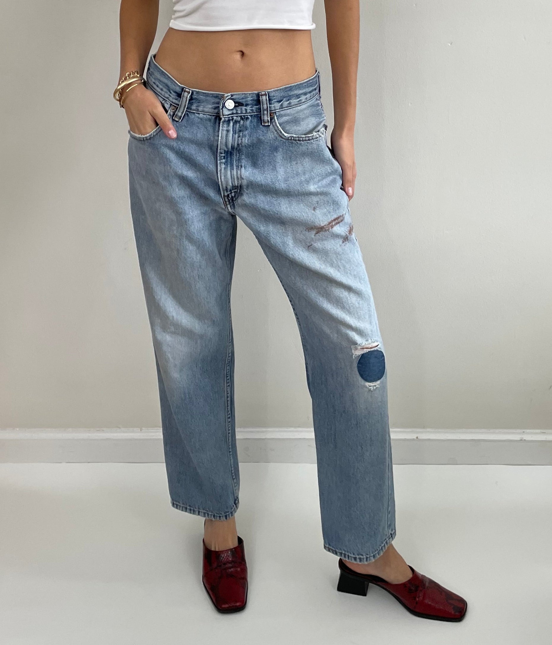 With natural fade and patched repair at knee. Paint stain below left front pocket. Slouchy boyfriend jeans with straight boot leg. Round iron-on patch applied inside jeans and outside jeans.
