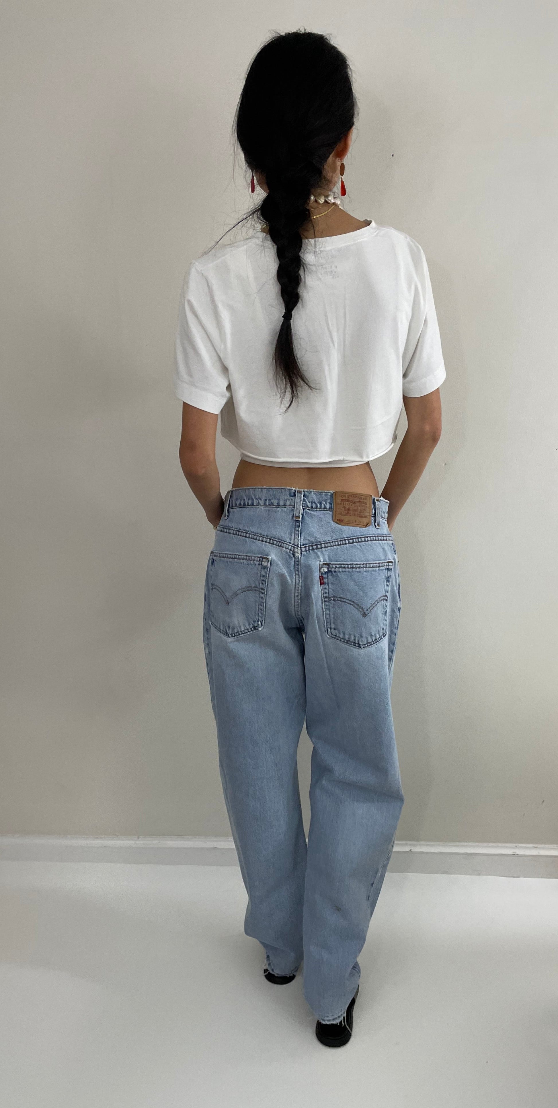 32x31 Vintage 1980s faded Levi's 560 made in USA featuring soft, evenly and naturally faded denim. With ultra high rise, loose fit, zipper fly and tapered leg. Wide thru hips + high rise - relaxed fit - like balloon leg.