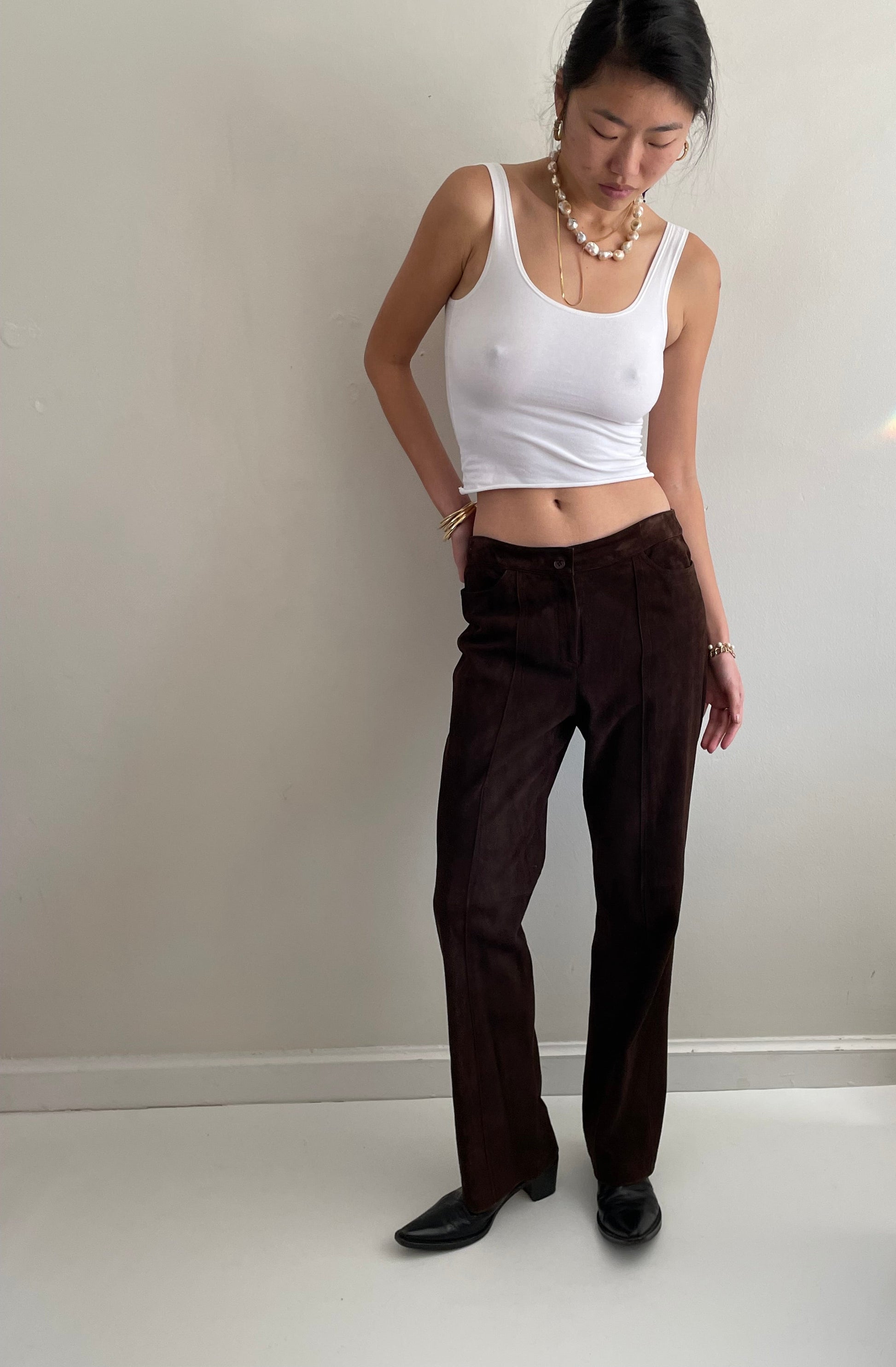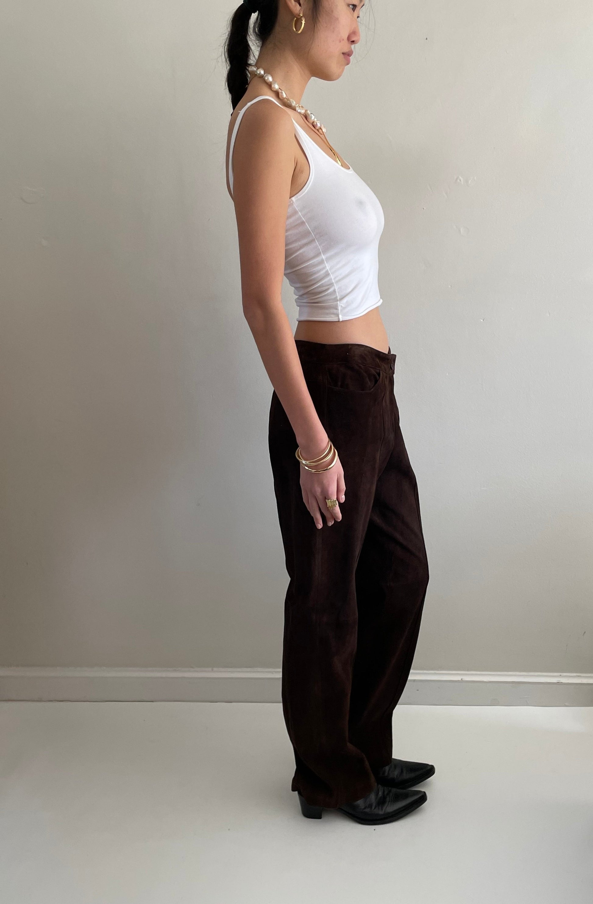 Vintage luxe, buttery soft chocolate brown sued pants. Featuring flat front with simple waistband and center piping down middle of leg.
