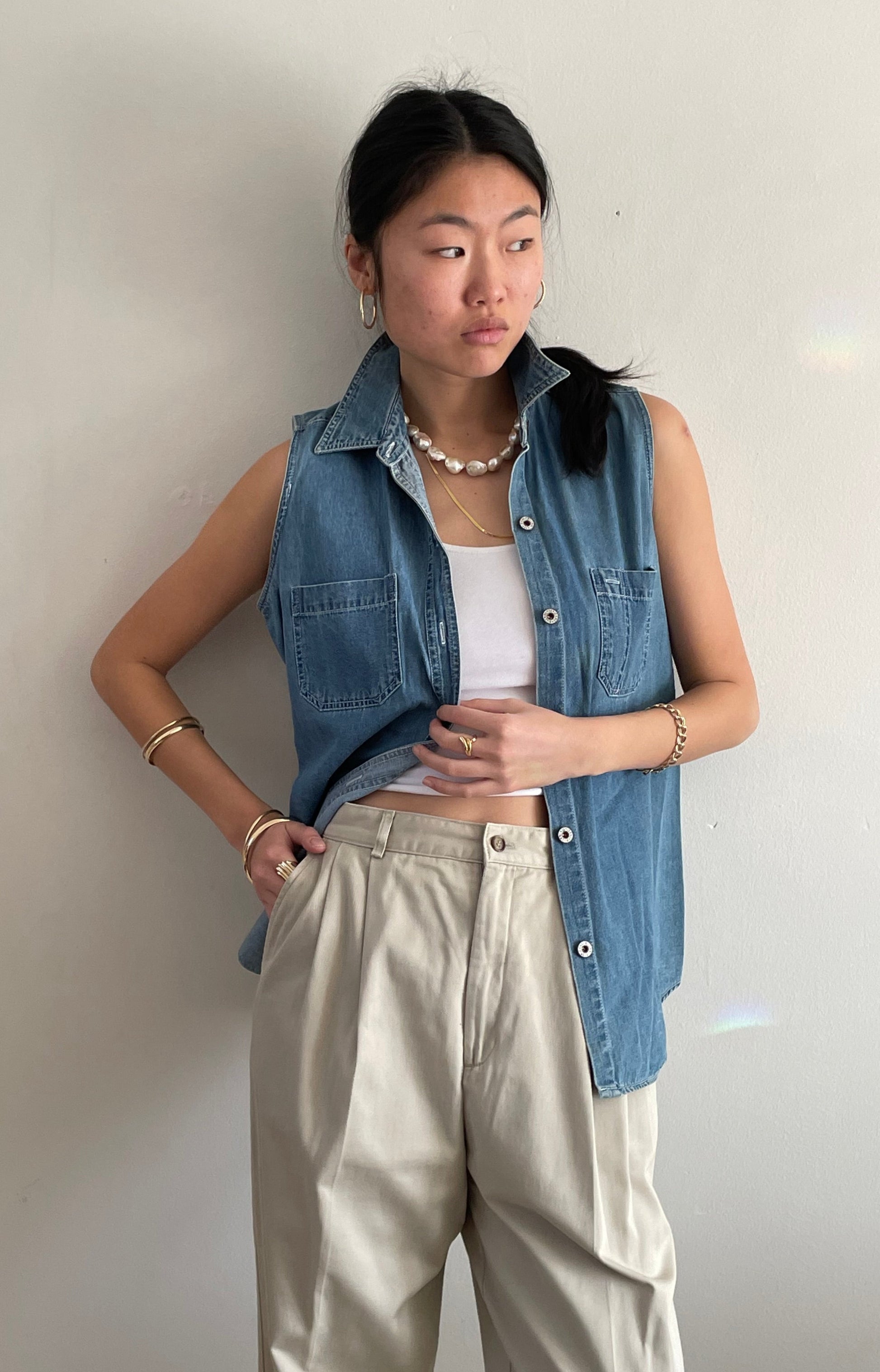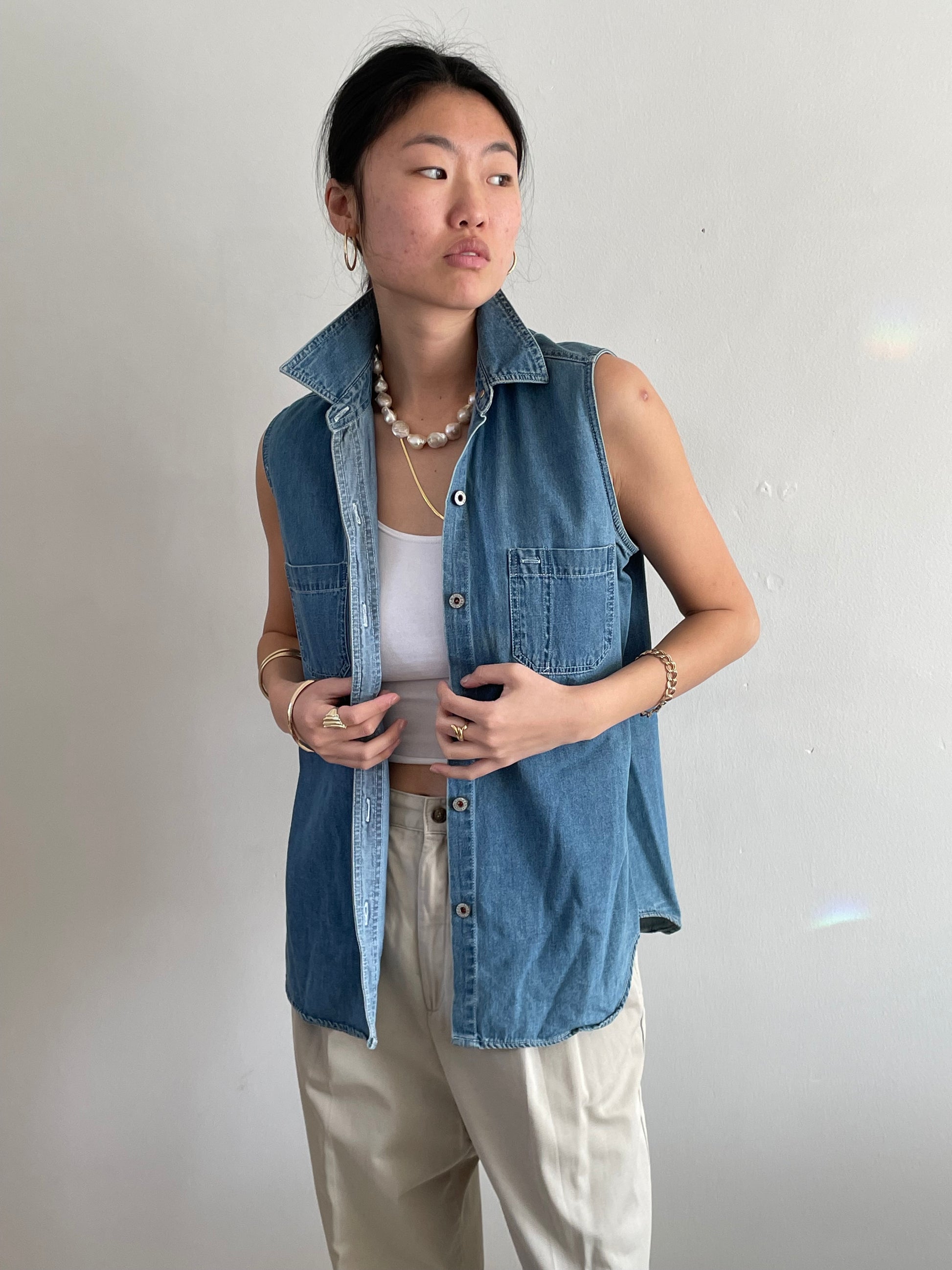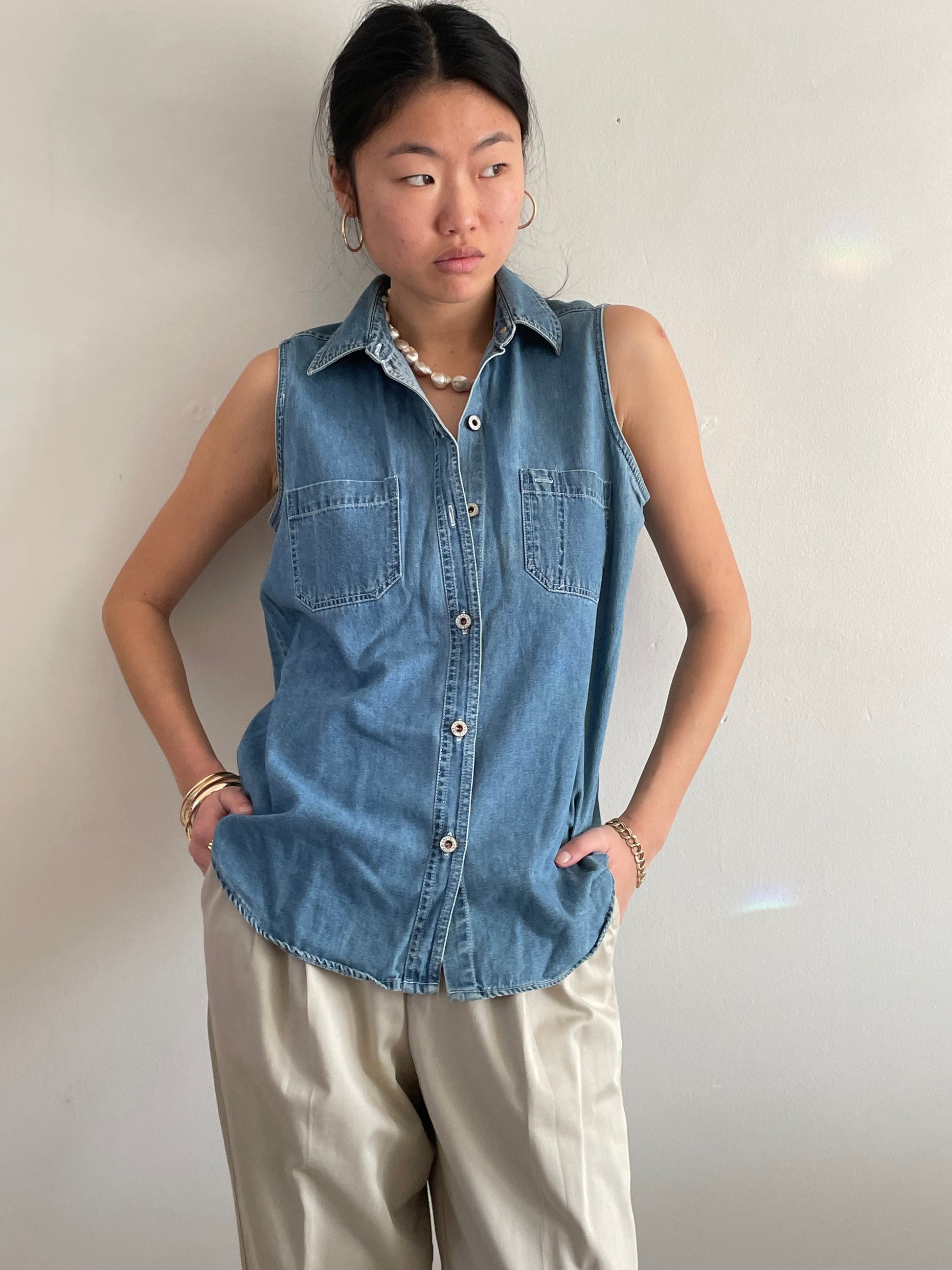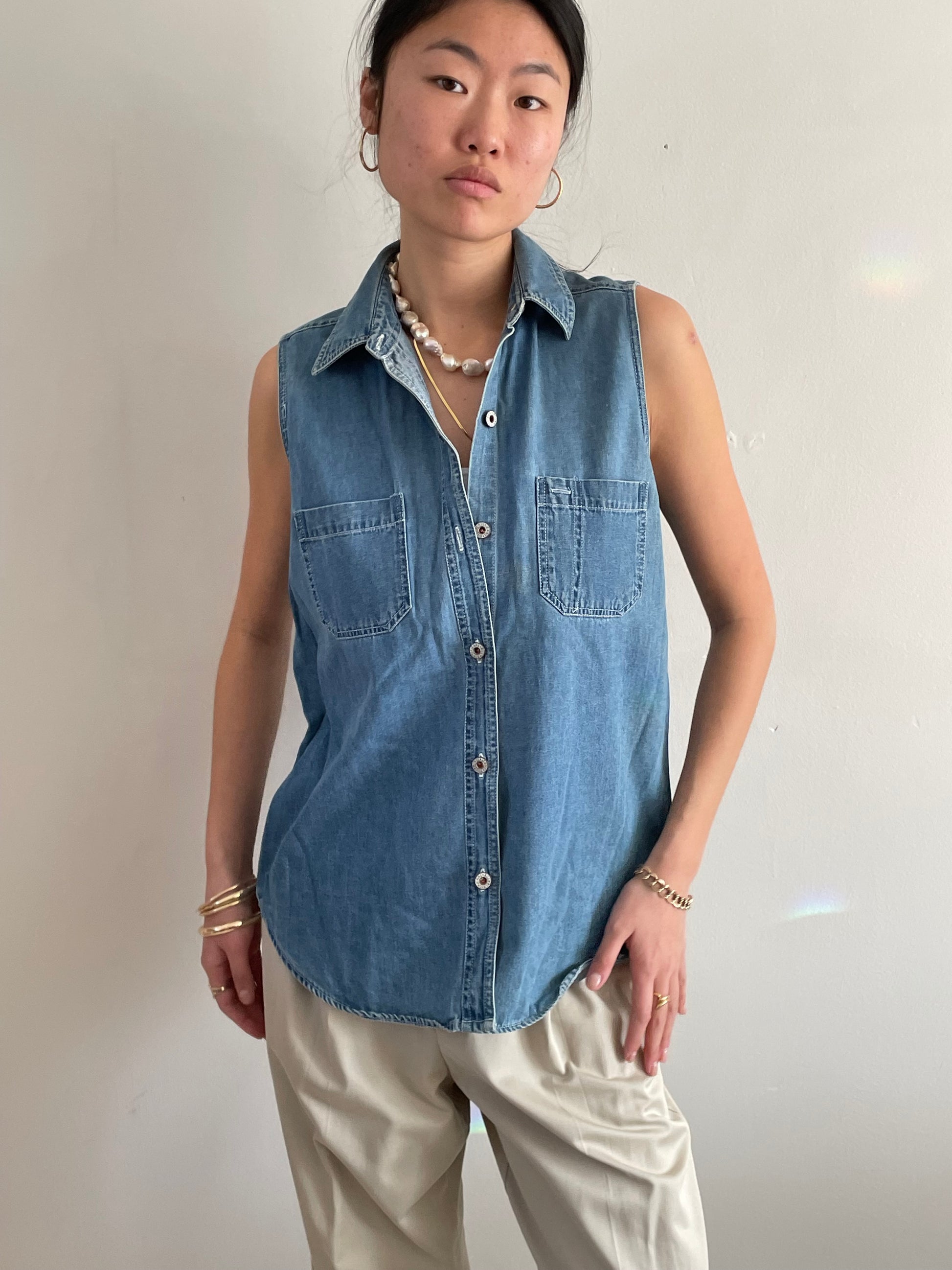Vintage Bill Blass faded denim sleeveless blouse featuring branded riveted metal buttons, relaxed fit, breast pockets, and shirttail hem.