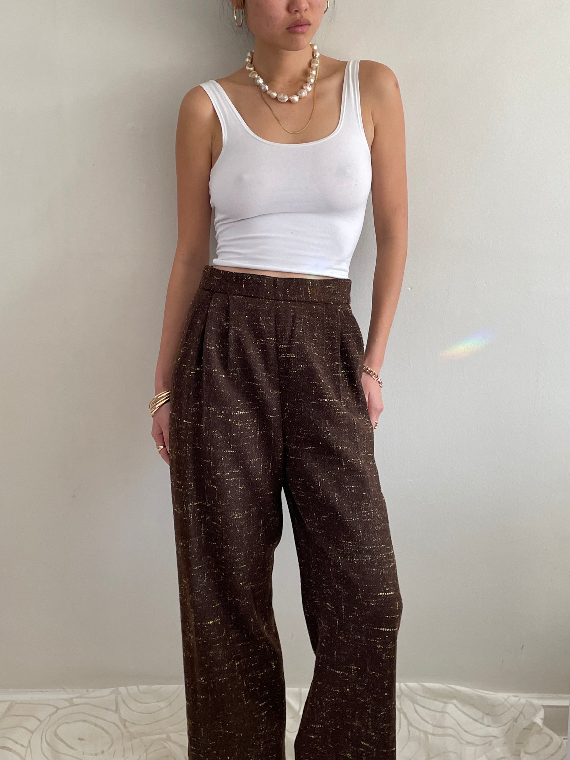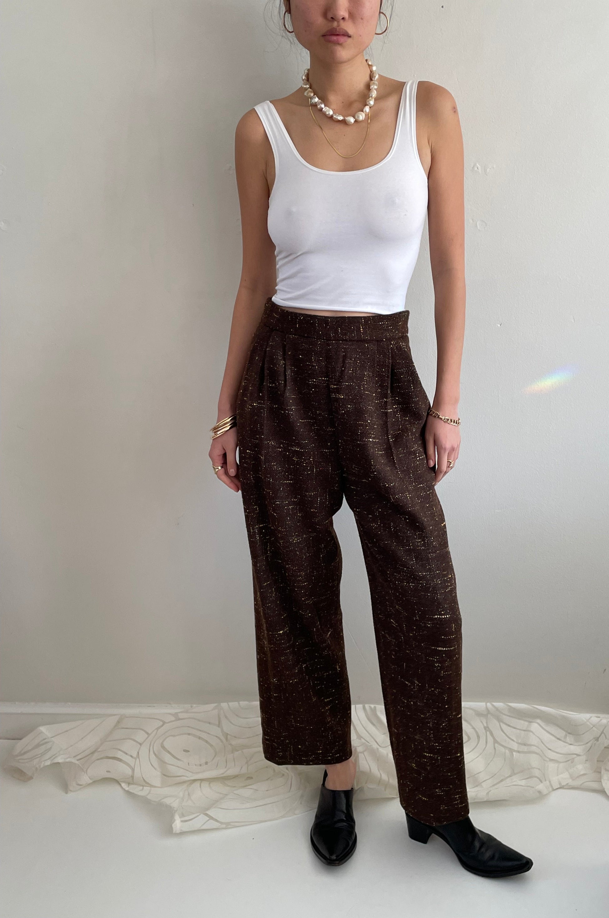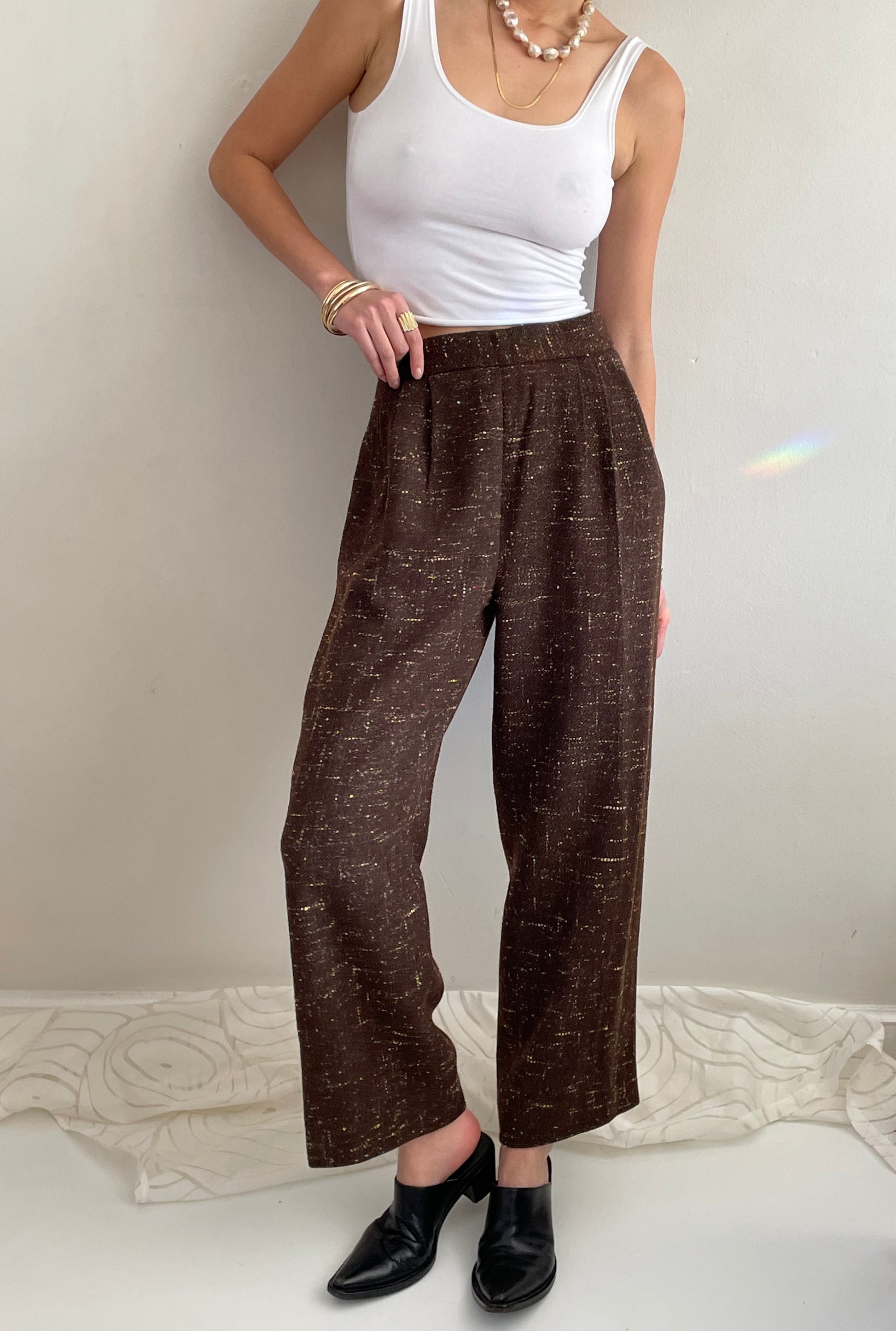 Vintage 90s Tweed Wide Leg Pleated Pants | Brown Wool Speckled Pants size 28 Waist