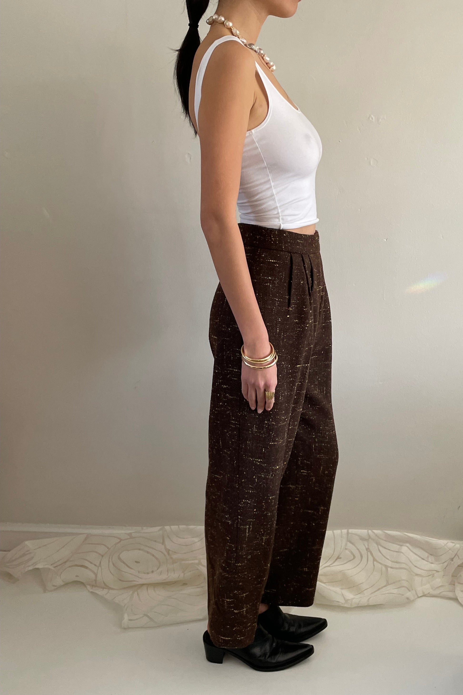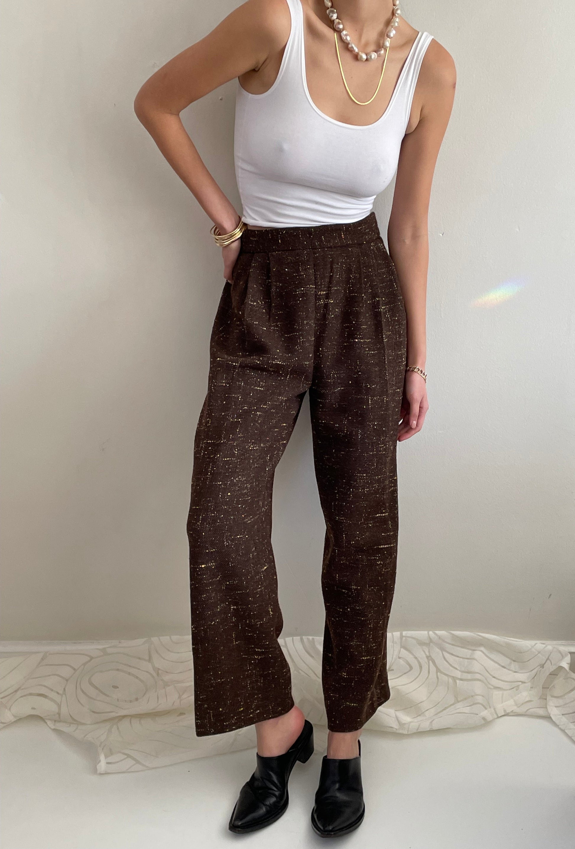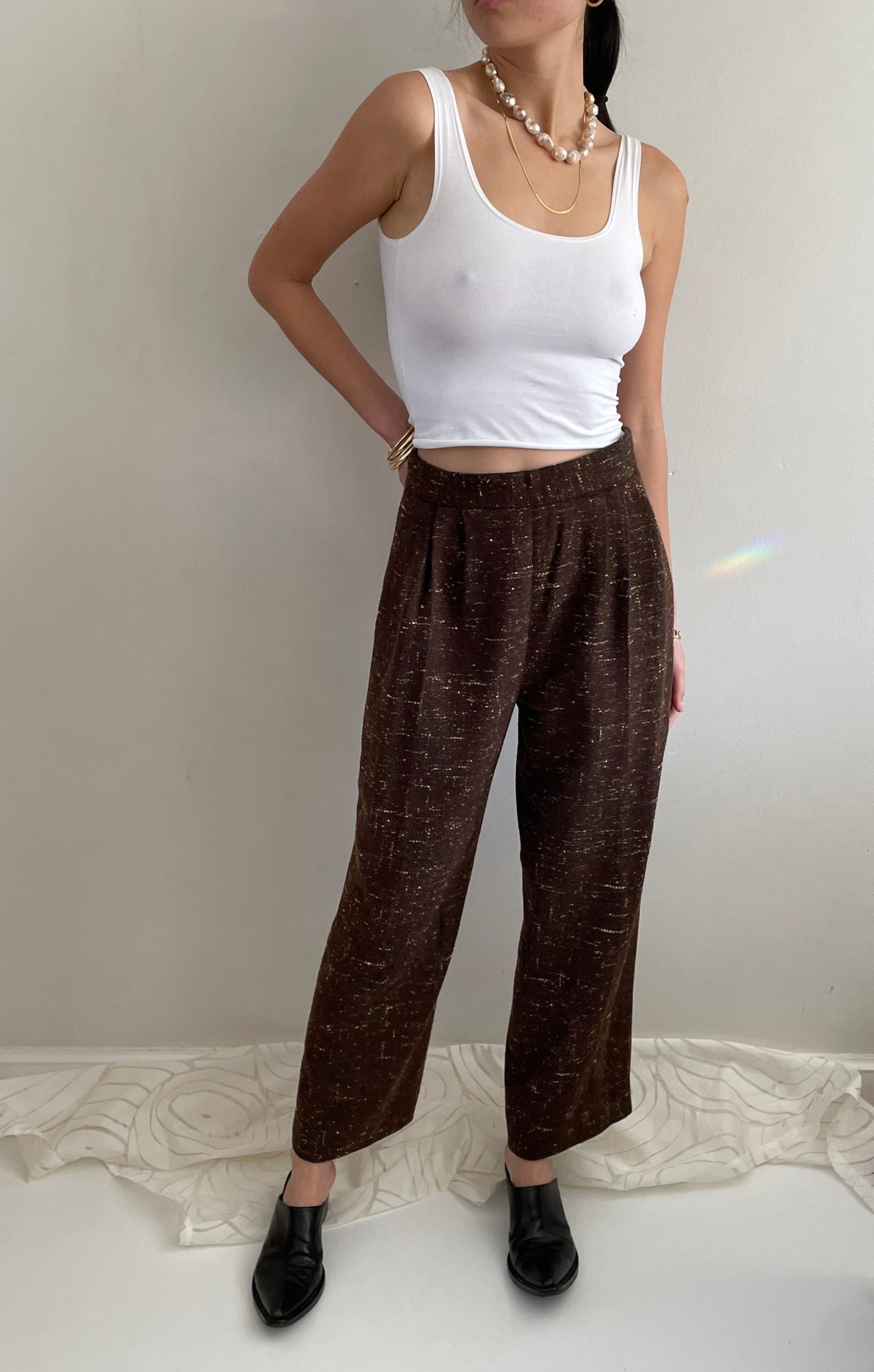 Vintage 90s Tweed Wide Leg Pleated Pants | Brown Wool Speckled Pants size 28 Waist