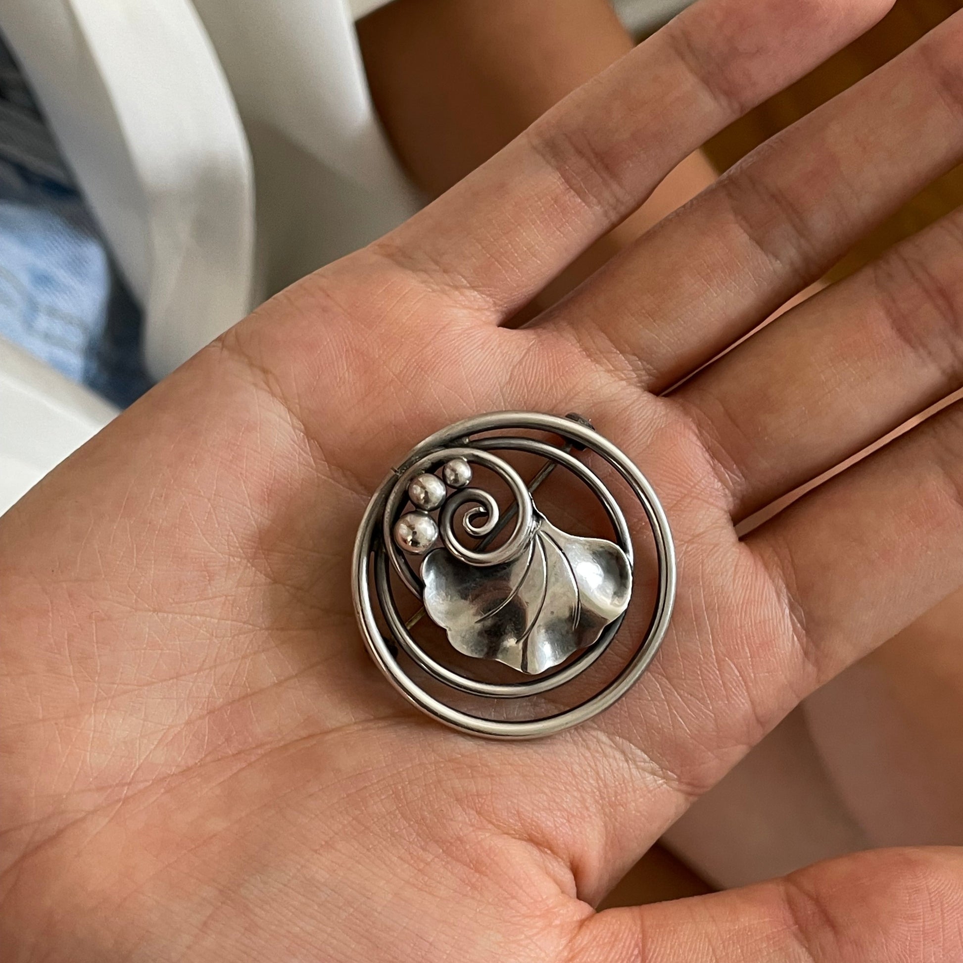 Vintage signed Georg Jensen brooch. Hand wrought sterling silver made in the USA featuring a circular Nordic design with a detailed leaft and berries.