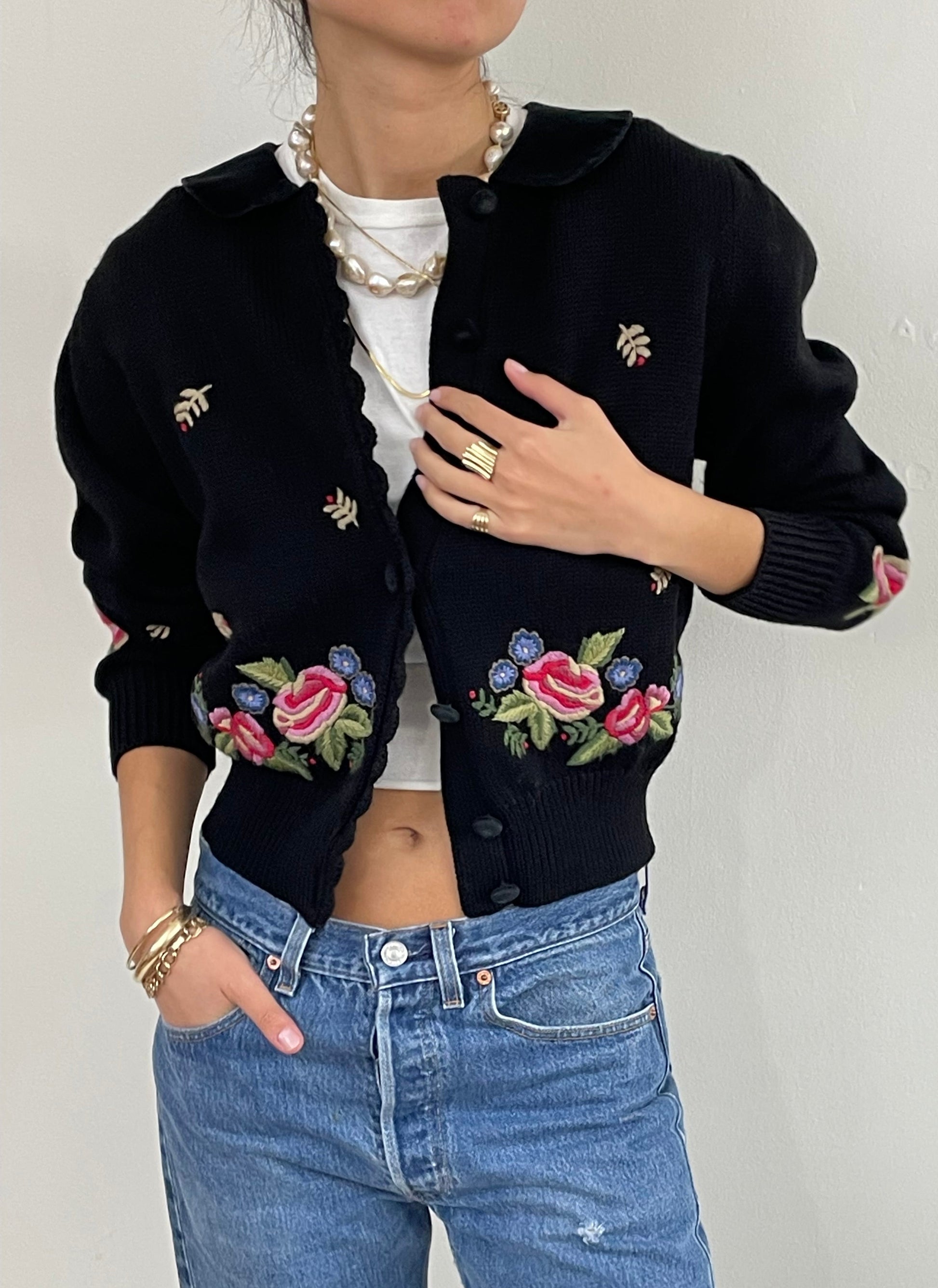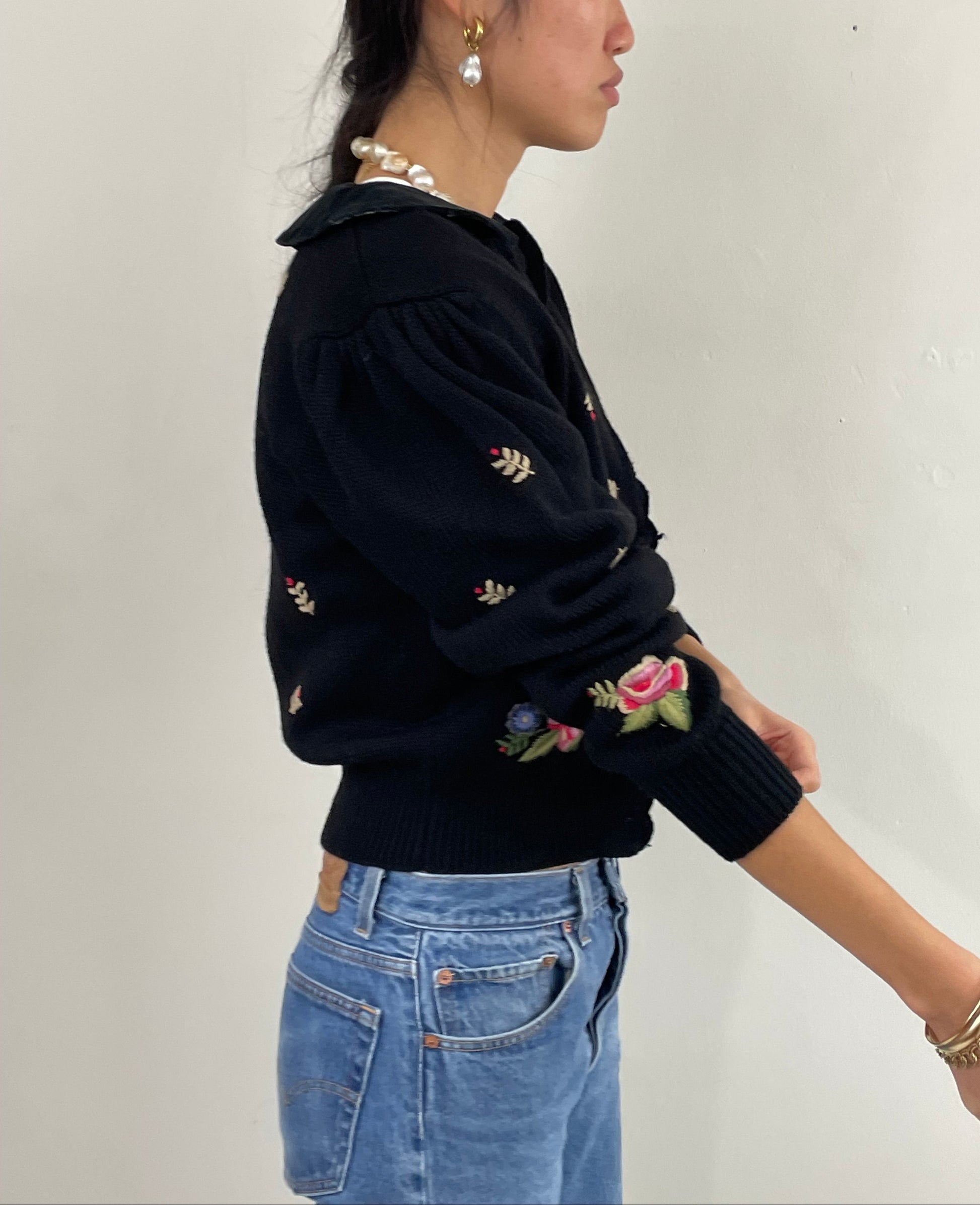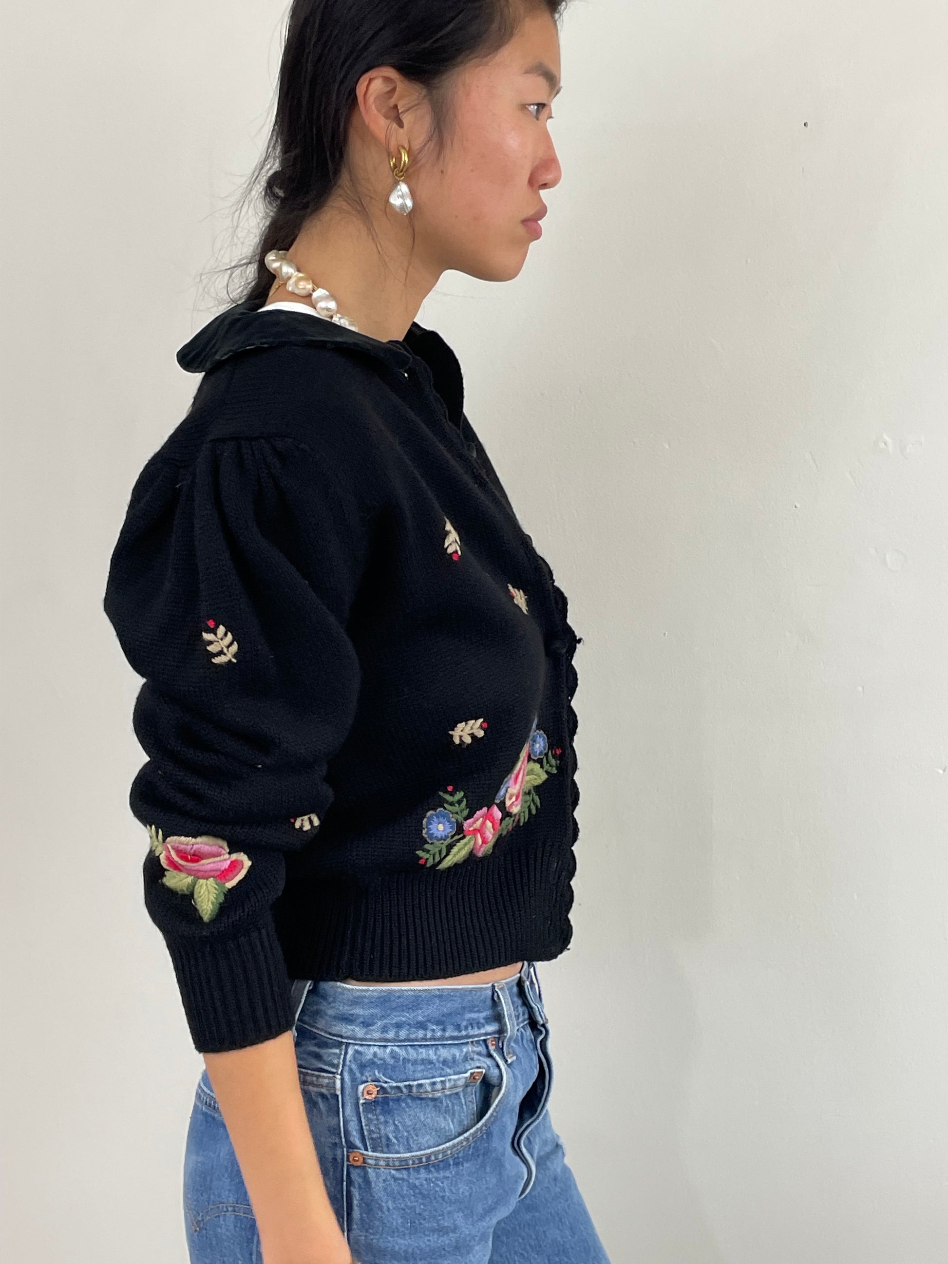 Vintage soft wool hand embroidered cardigan sweater. Featuring vivid floral crewel work embroidery throughout. With velvet peter pan collar and velvet covered buttons. Scalloped edging, sweet puffed sleeve and slightly cropped length.