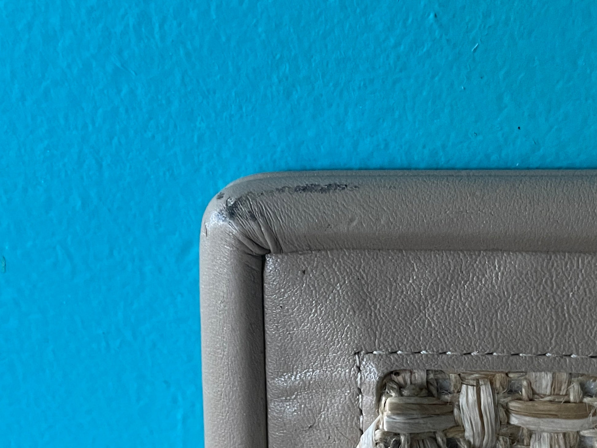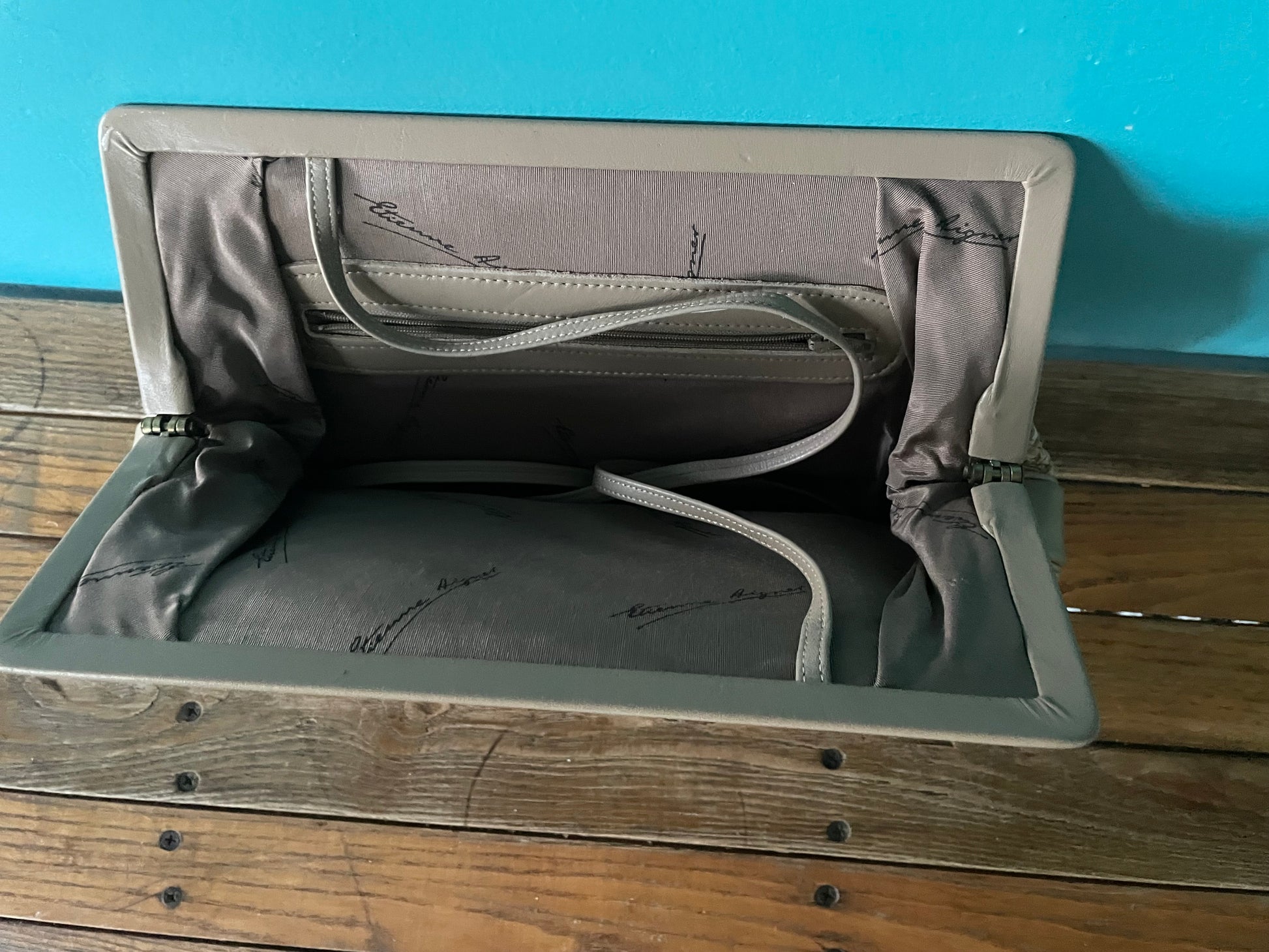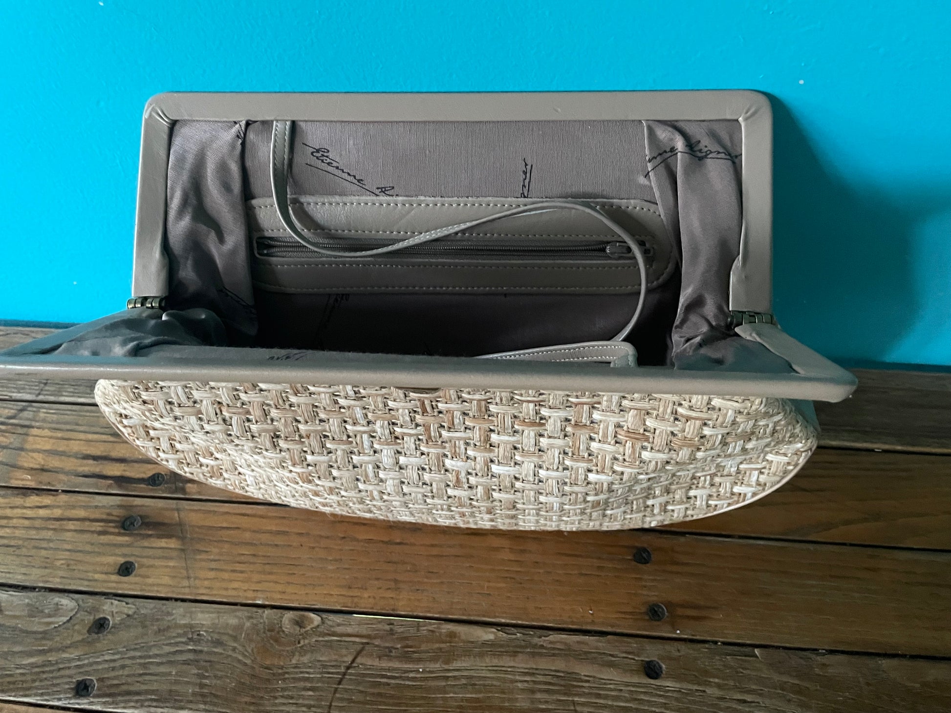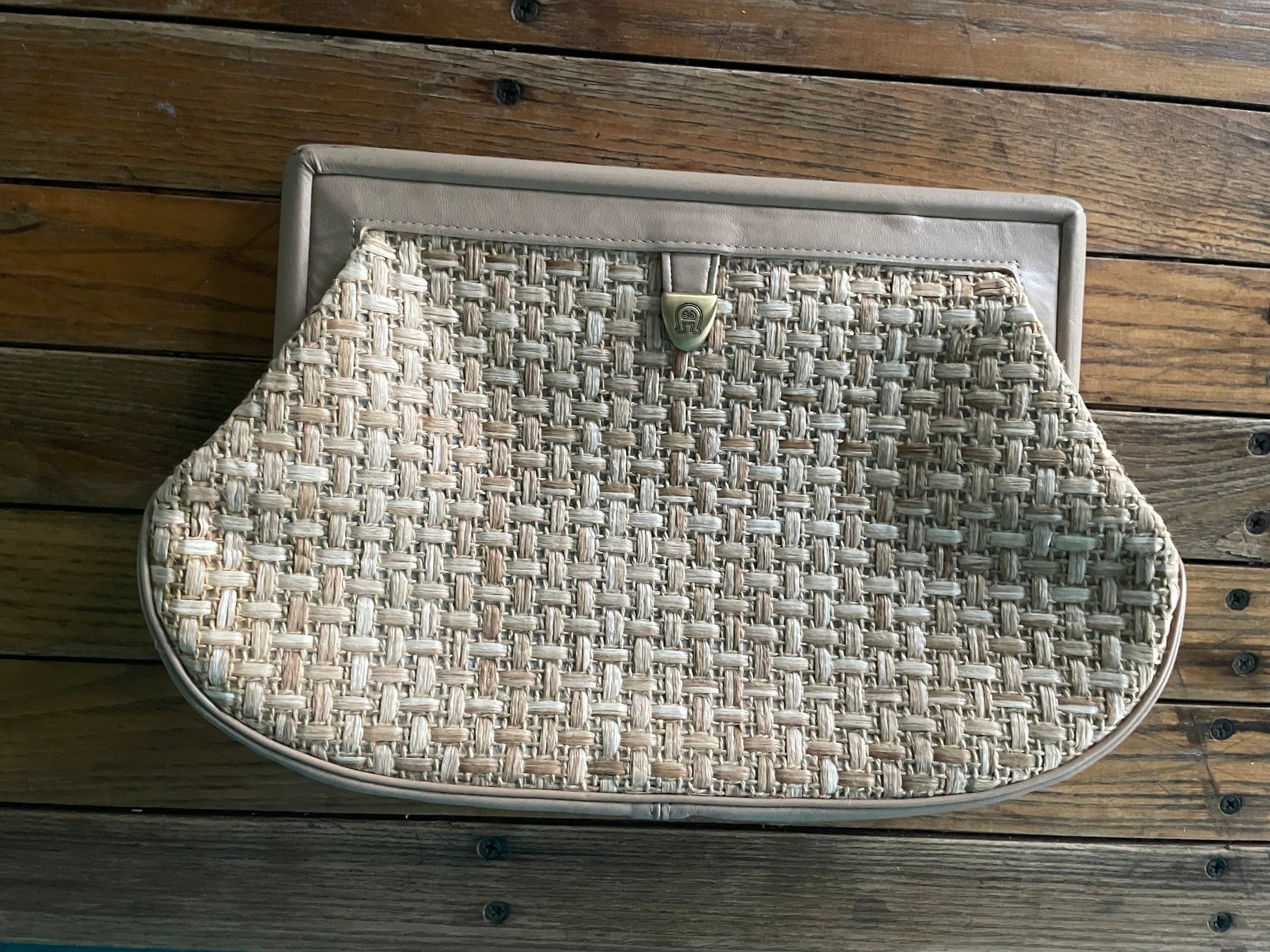 Vintage Etienne Aigner purse featuring woven rattan outer with taupe leather trim. Sturdy wide, hinged opening with thin leather shoulder strap for conversion from clutch to crossbody.