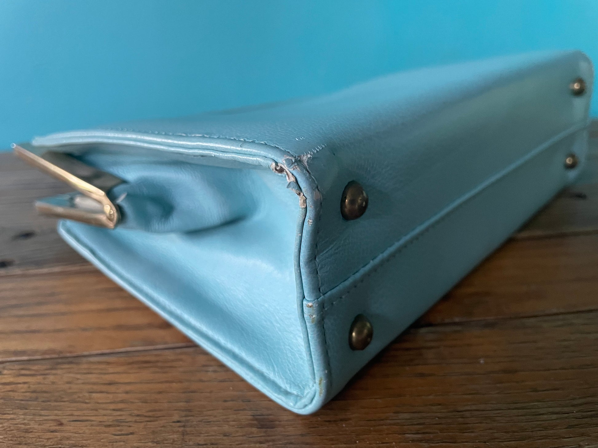Vintage robins egg blue faux leather top handle purse. Featuring vibrant color, single top handle and sturdy snap closure. With brass trim and brass feet. Single inner envelope pocket.