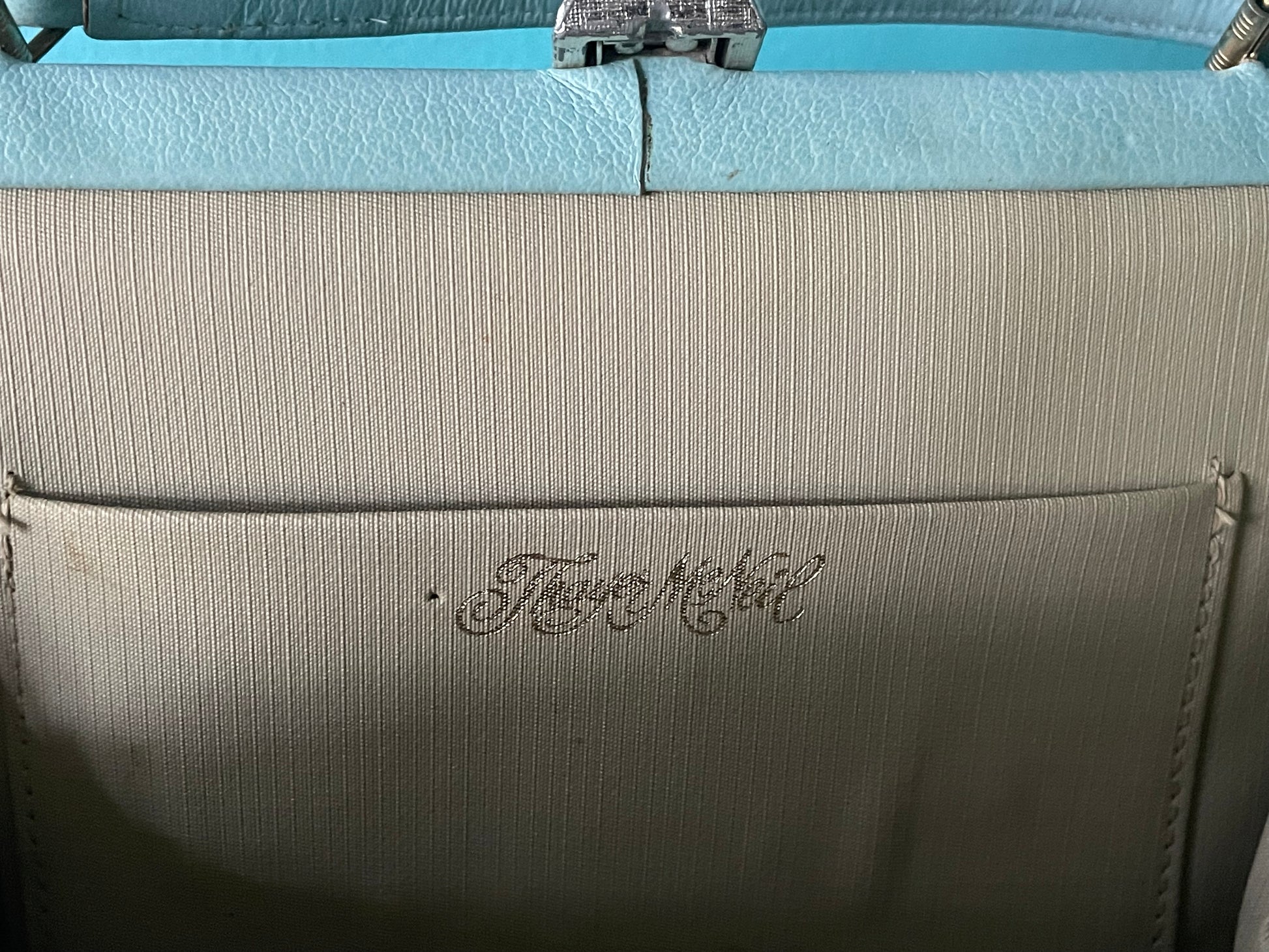 Vintage baby blue top handle 60s Thayer McNeil faux leather vinyl box purse handbag made in USA