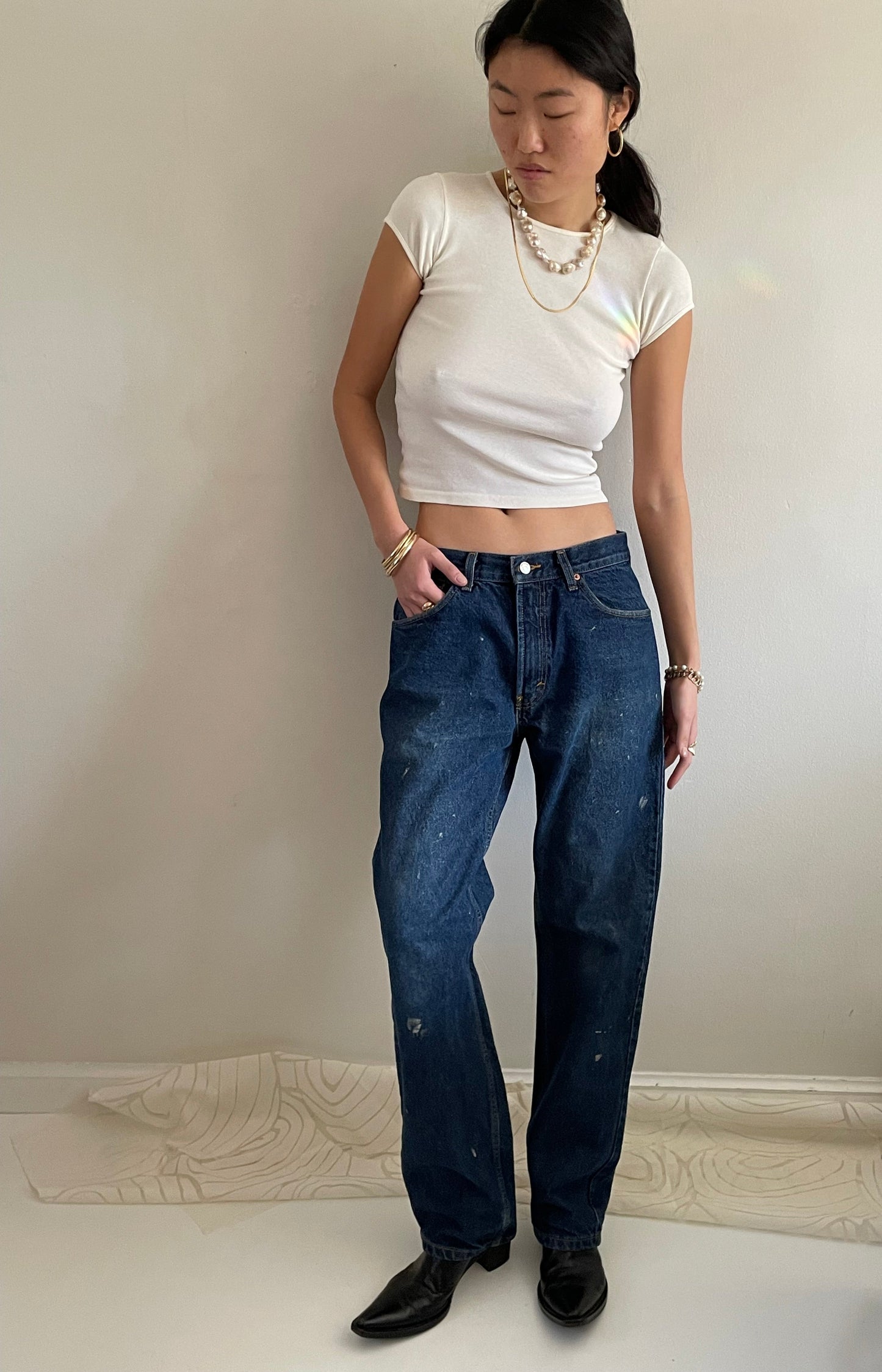 90s Vintage Levi's 505 zipper fly boyfriend jeans featuring dark wash denim and relaxed fit. With wide, straight boot leg. Speckled with bleach and putty colored paint on front thighs and bleach ring near back pocket.