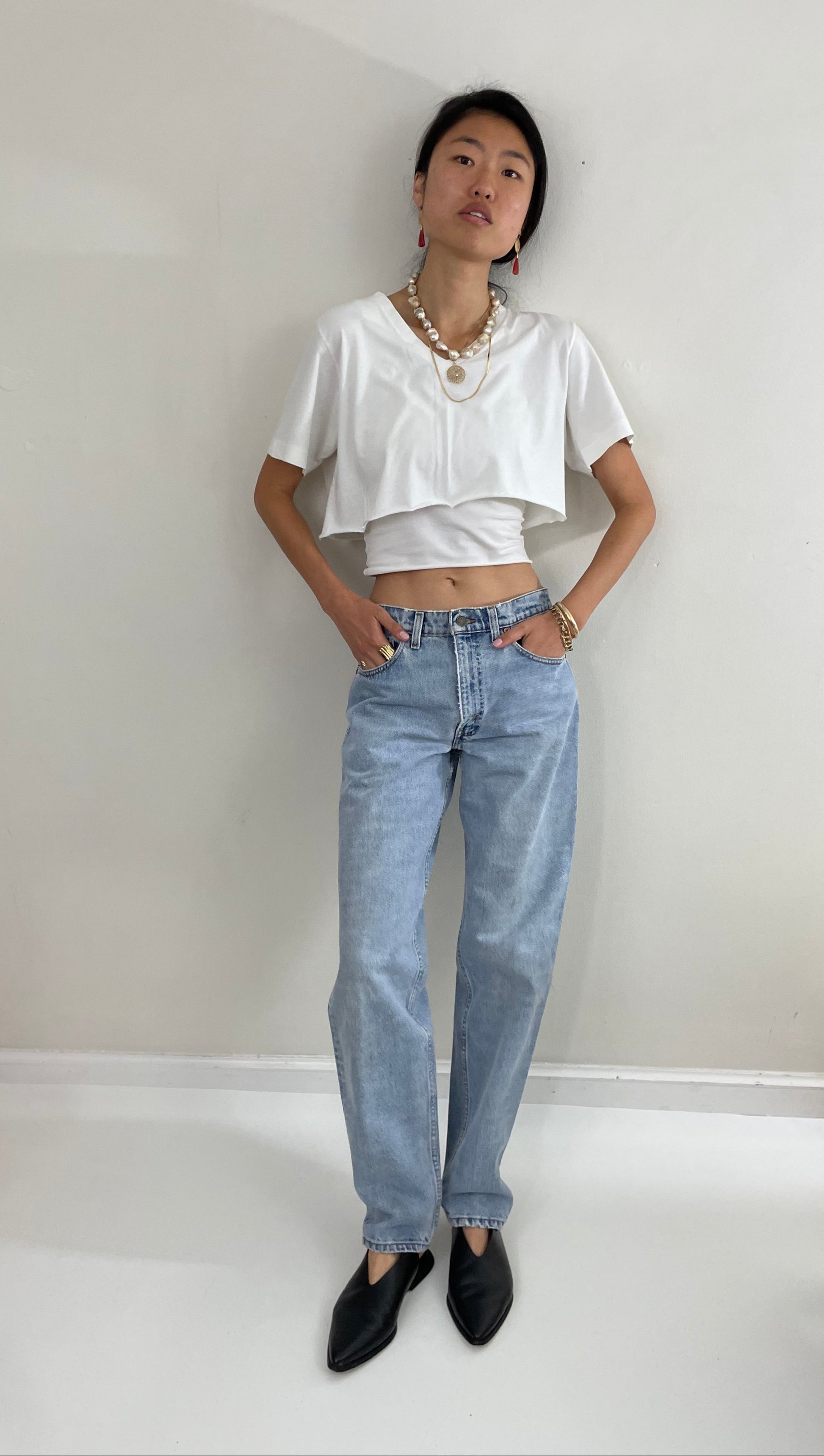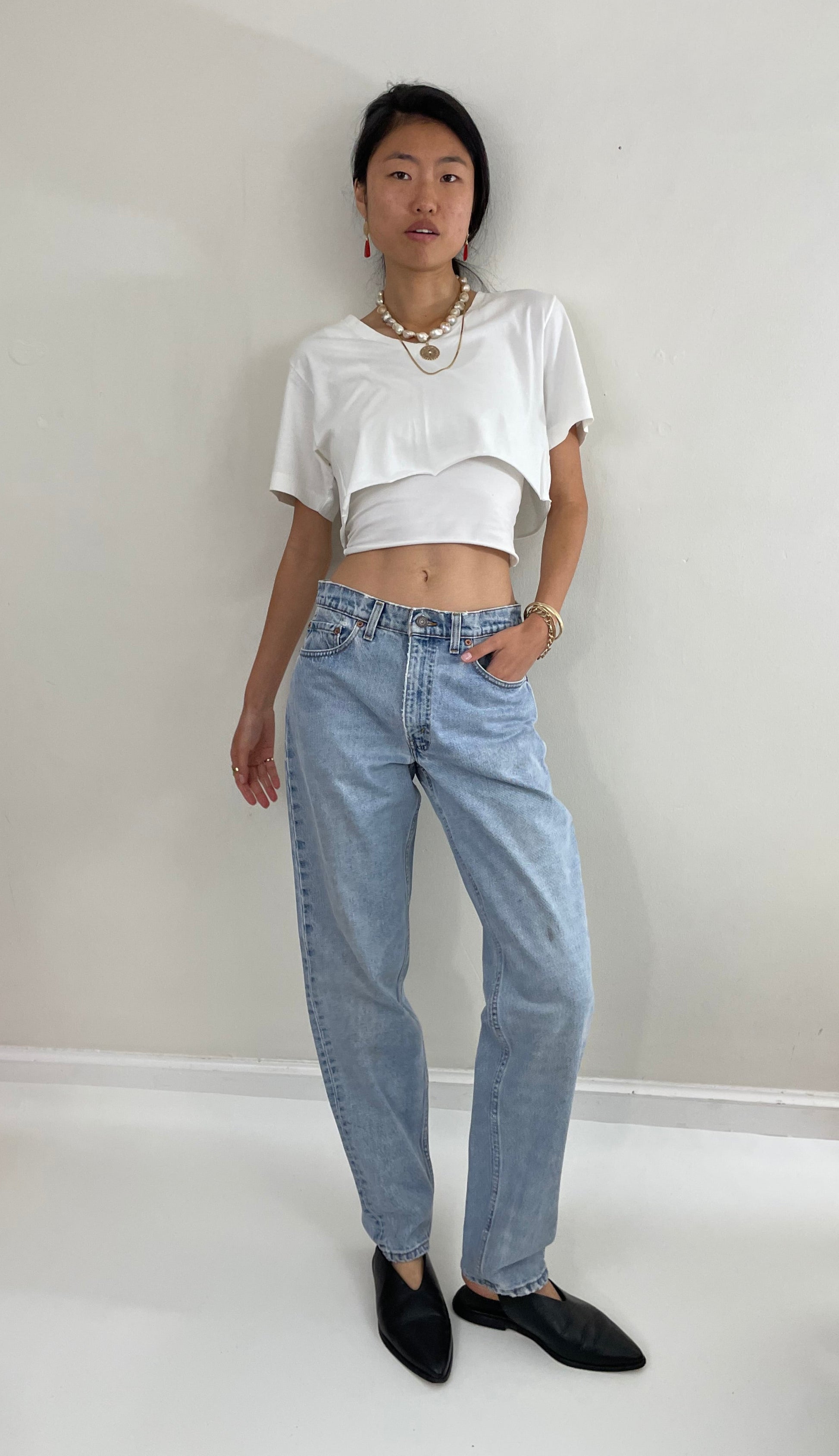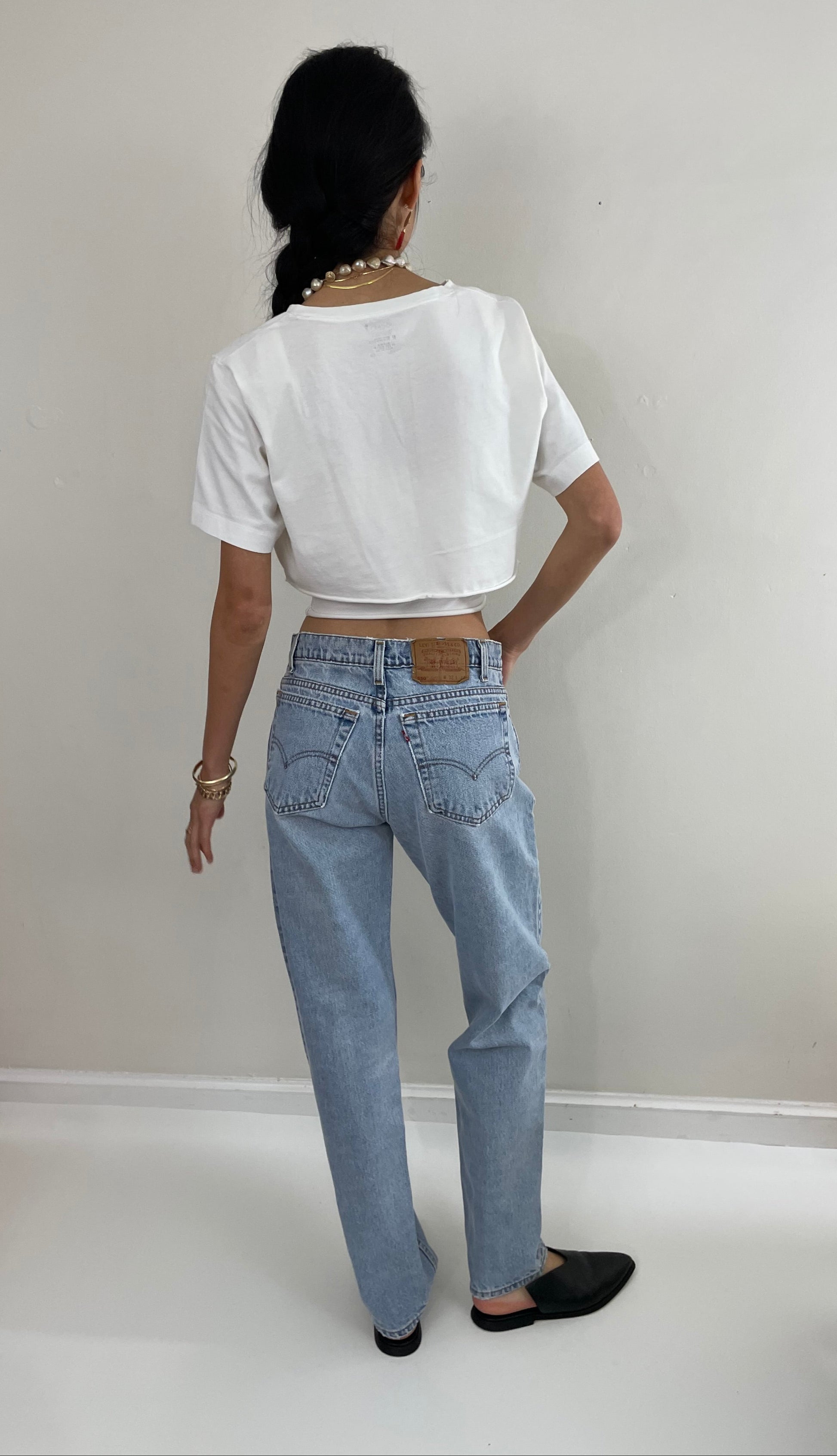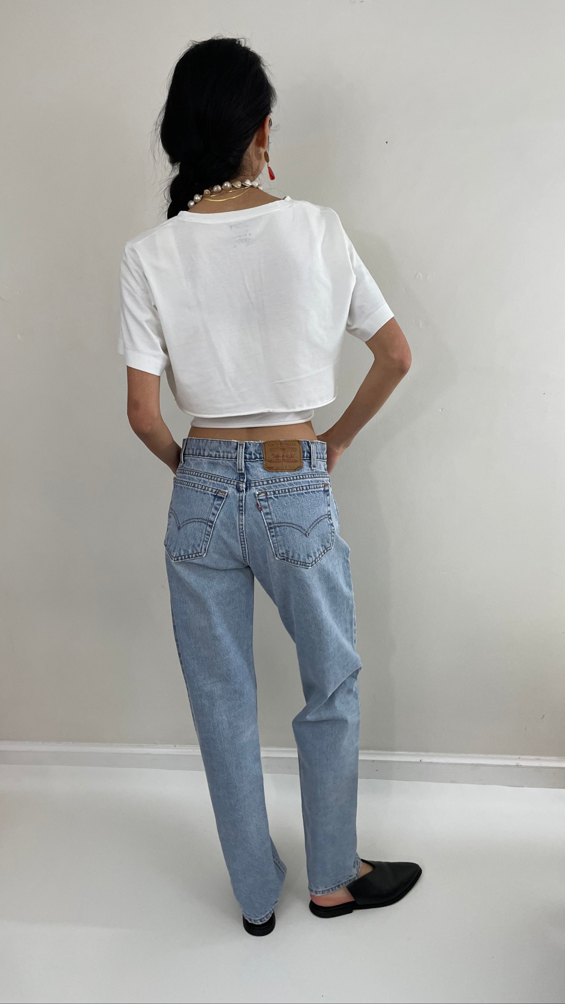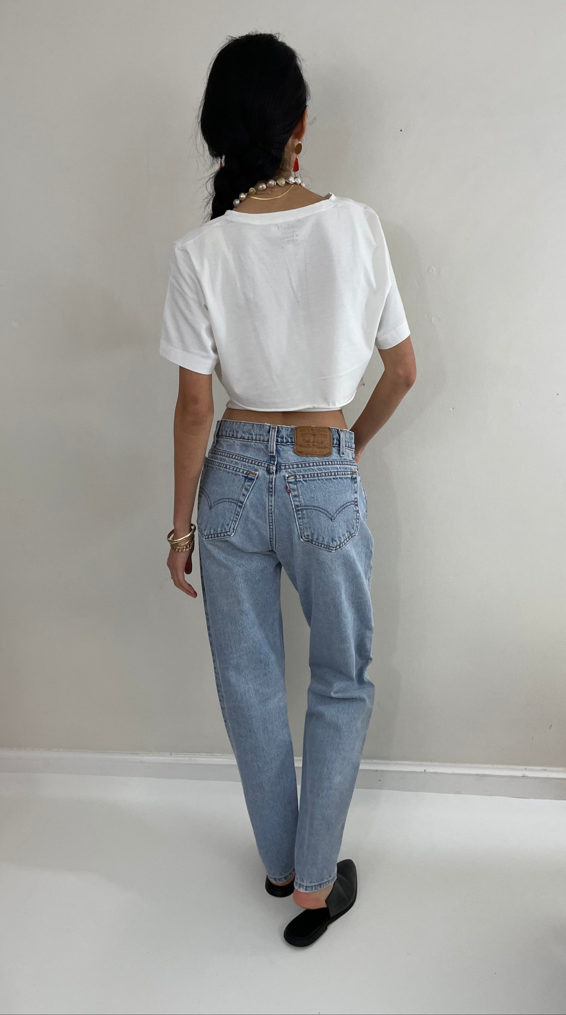 Vintage Levi's 550 made in USA featuring an allover naturally faded soft, light wash denim. With no major wear but some very light fray at thigh.