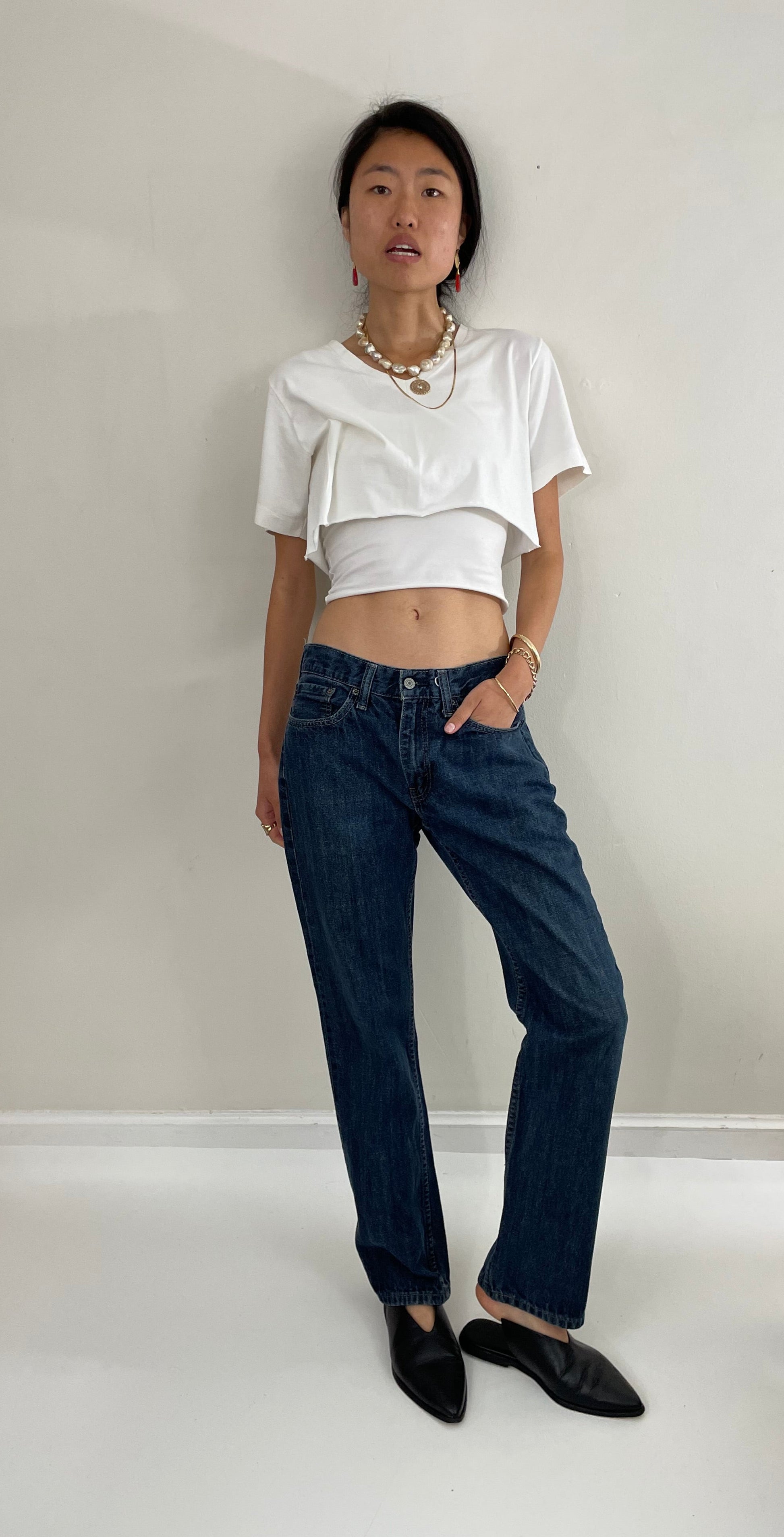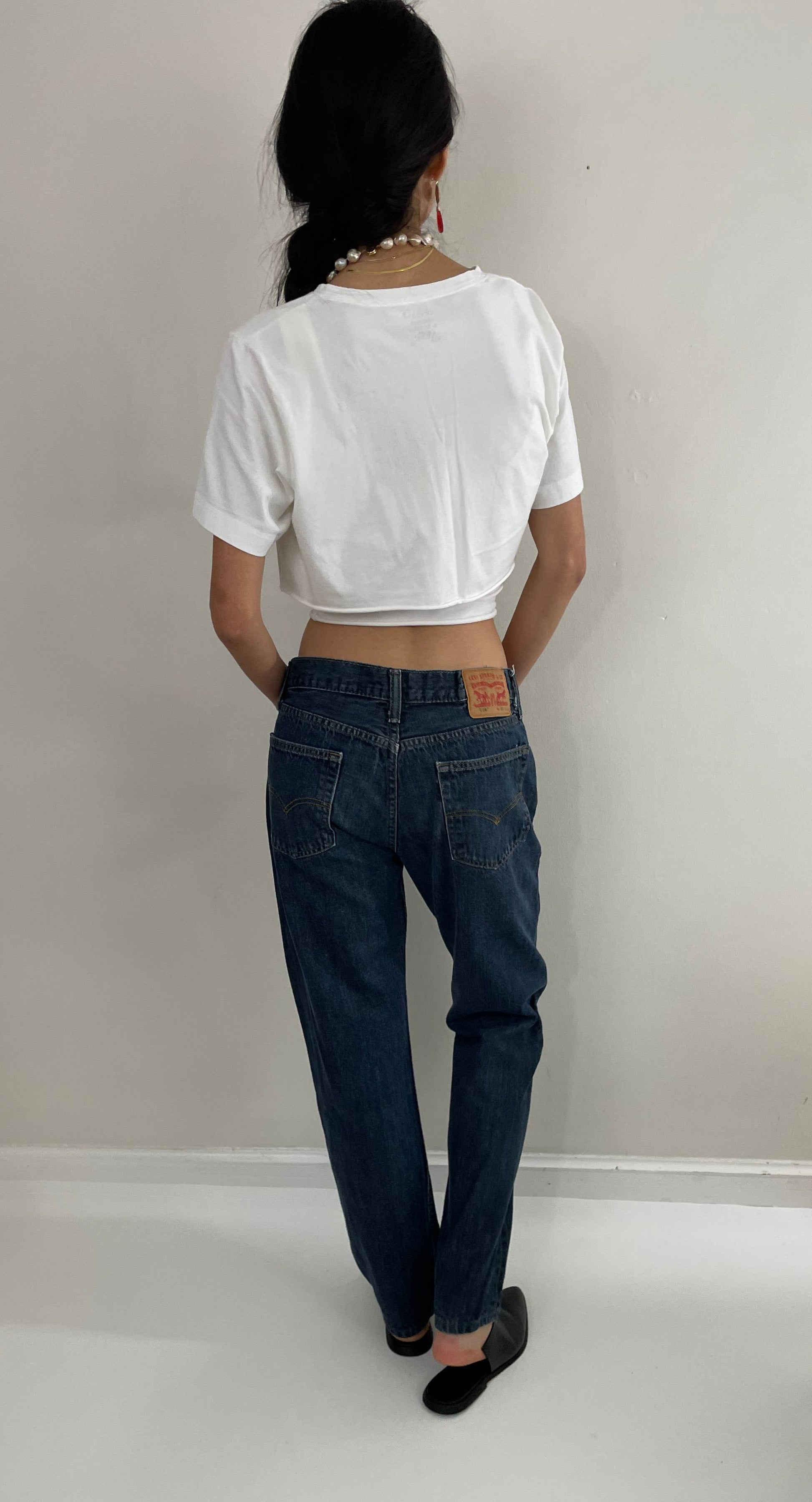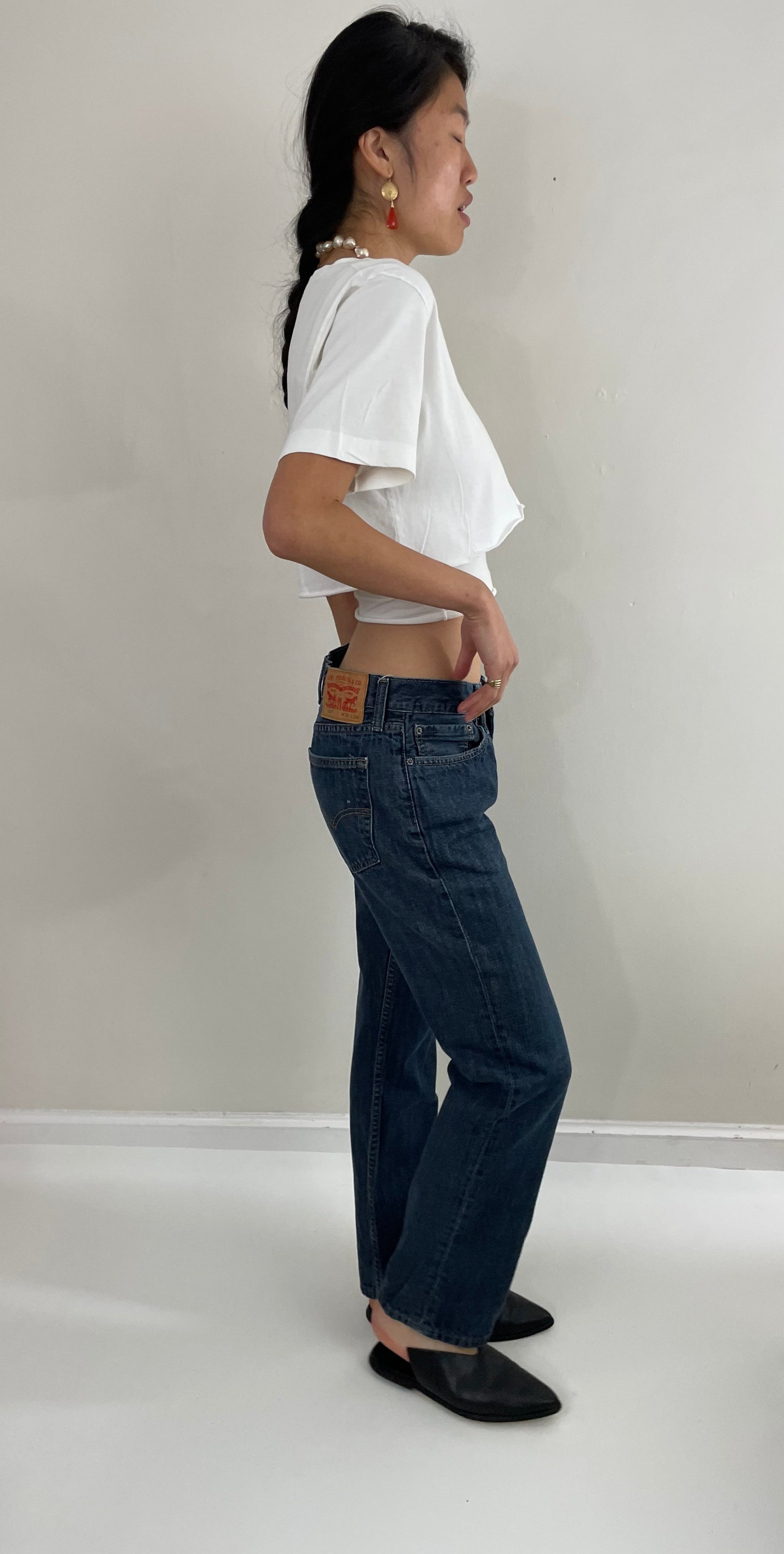 Vintage Levi's 514 Y2K jeans. Featuring evenly faded medium dark wash denim with mid rise and zipper fly. Excellent vintage condition with no fray, holes or stains - previous owner has removed red tab at back pocket. Comfortable lighter weight denim in relaxed fit.