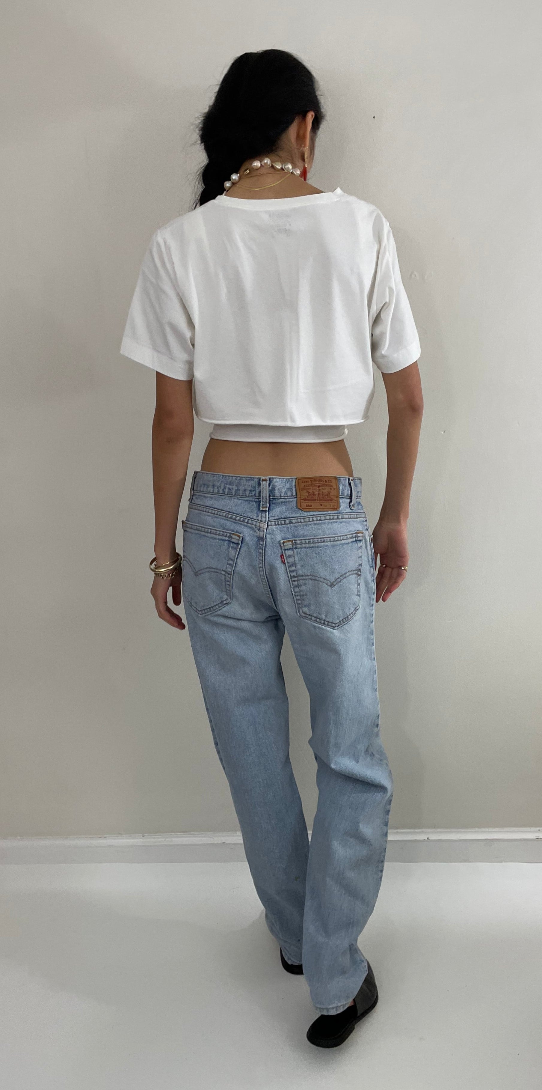 Vintage Levi's 550 made in USA featuring an allover naturally faded soft, light wash denim. With no major wear but isolated small coin hole at right thigh and small smudge at left inner knee.