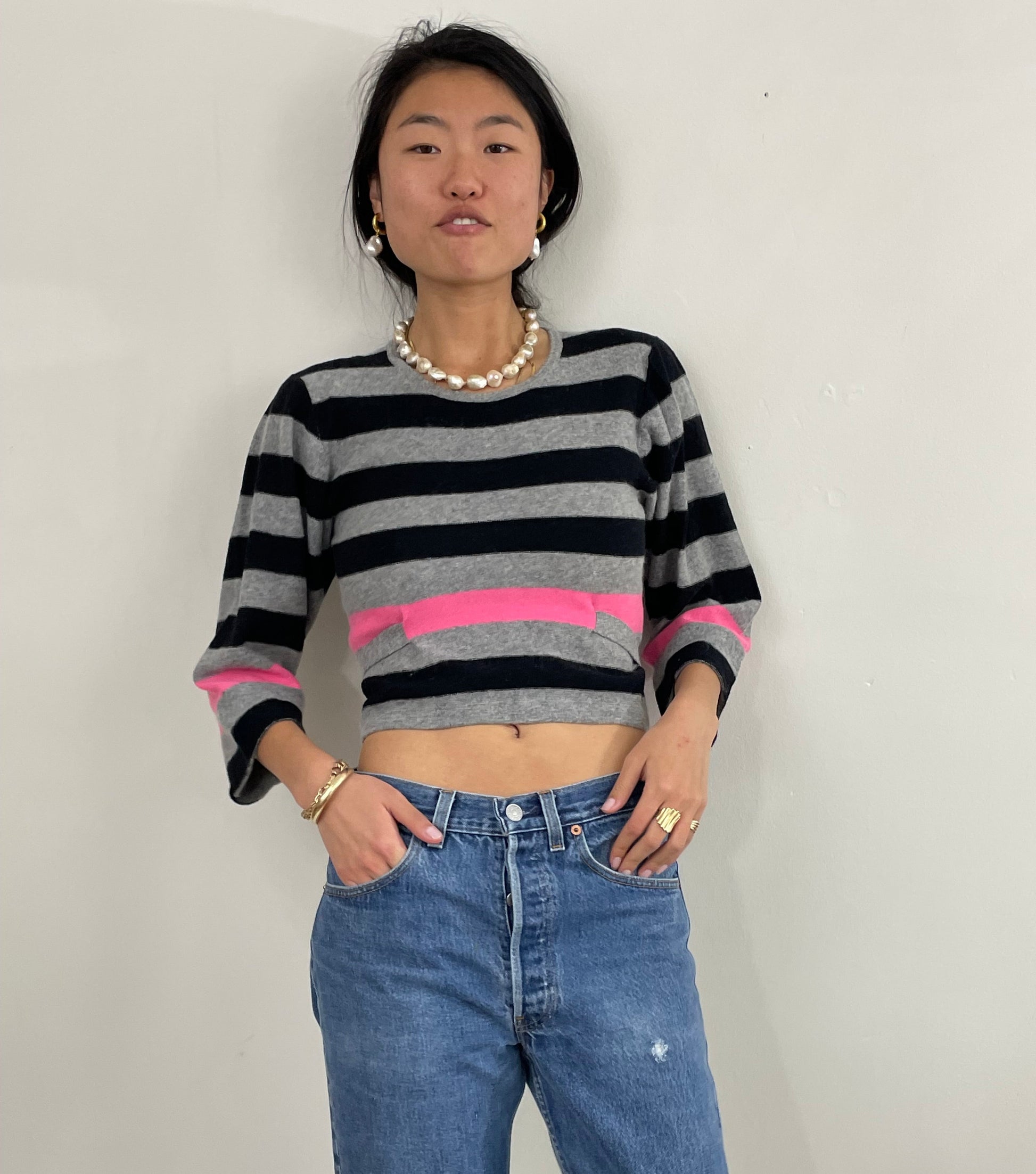 Vintage Sonia Rykiel wide awning striped sweater made in Italy. Featuring cropped length, picot trim at neckline, wide balloon sleeve and attached self tie belt.
