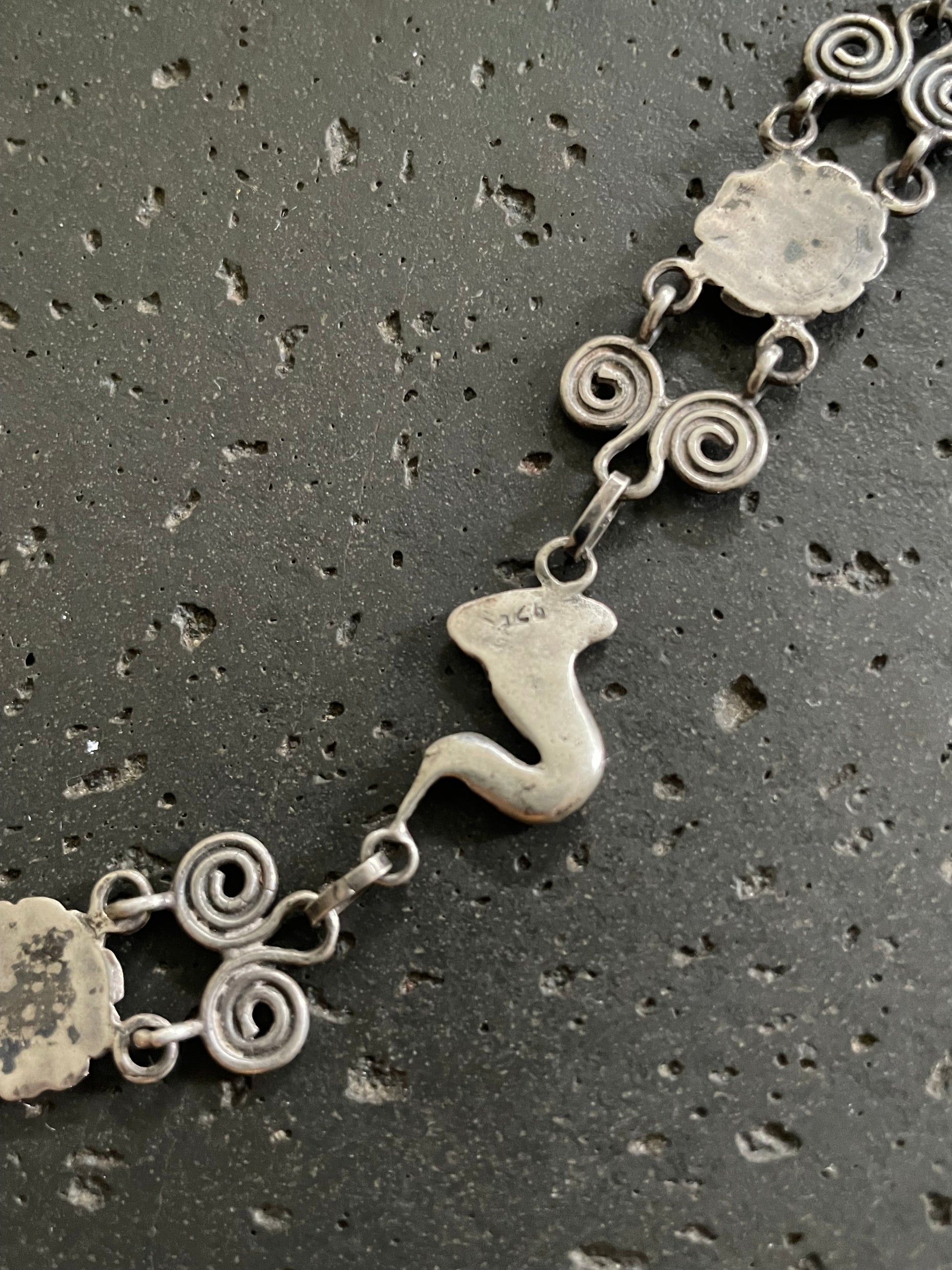 Stylish and mod Taxco sterling silver linked necklace featuring birds, flowers and swirls handcrafted in Mexico and purchased by me in 1986.